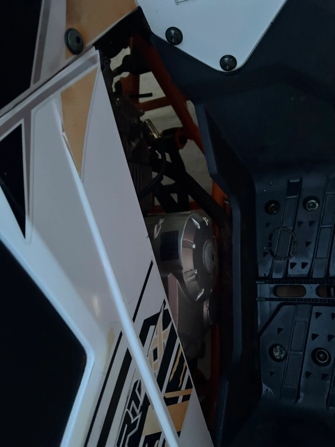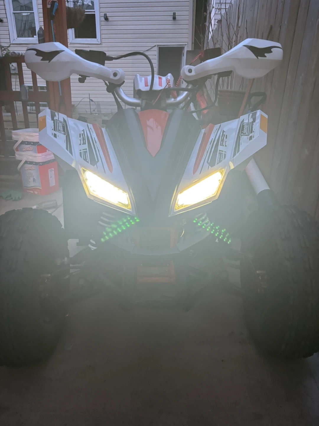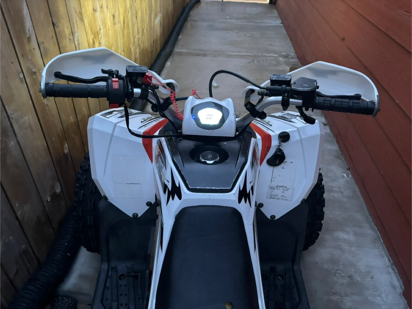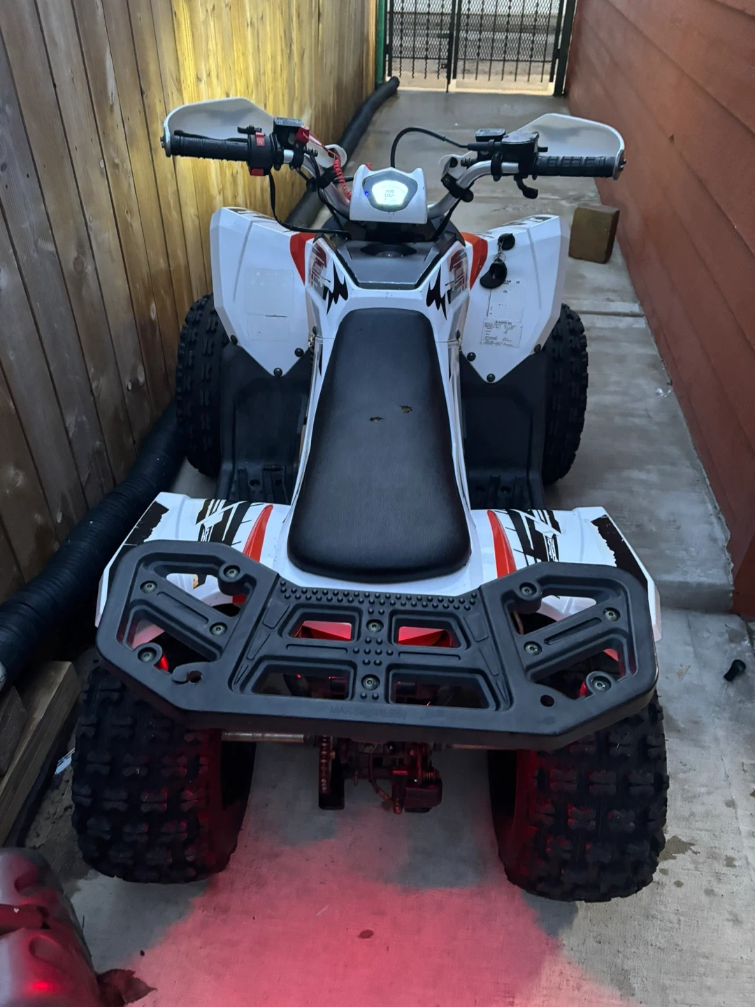 This Coleman AT125EX Sport ATV is white with black and orange accents. It's designed for recreational use and features rugged tires. Perfect for off-road adventures!