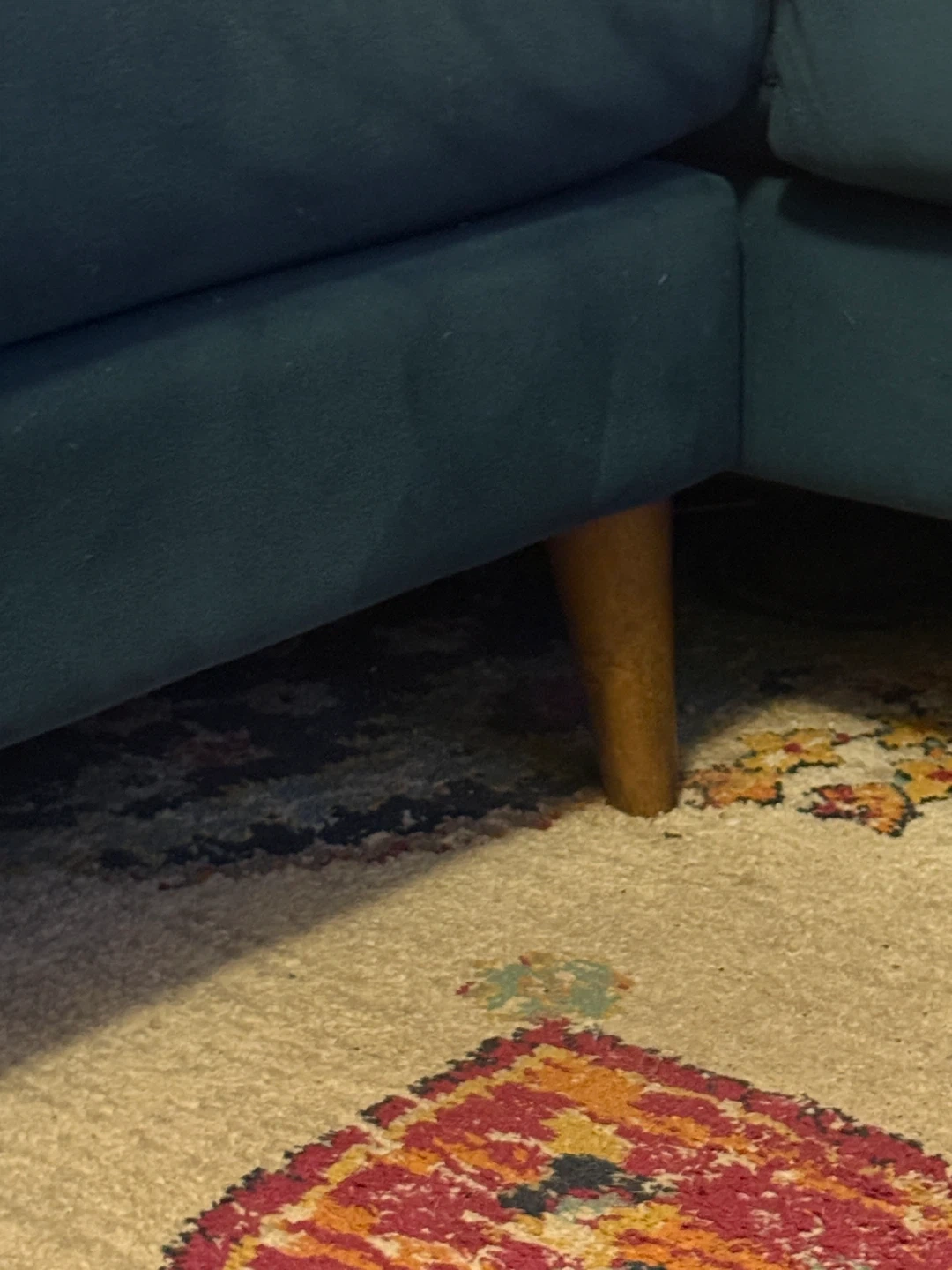 This stylish and comfortable sectional sofa features a deep blue upholstery with a soft, smooth texture and a modern silhouette. The rounded arms and tapered wooden legs give it a clean, mid-century look that works well in a variety of spaces.