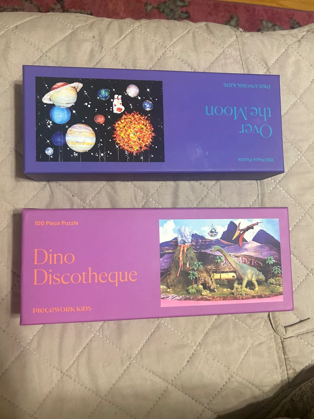 Two fun puzzles from Piecework Kids! Features a 'Dino Discotheque' scene with dinosaurs and a volcano and an 'Over the Moon' space scene with planets and an astronaut. Each puzzle has 100 pieces