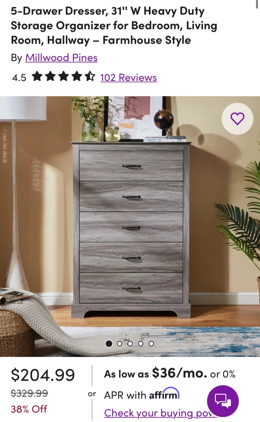 This 5-drawer chest is 31" wide and features a farmhouse style. It's constructed from manufactured wood with real wood veneers and solid wood components. The drawers are spacious and designed for storage.