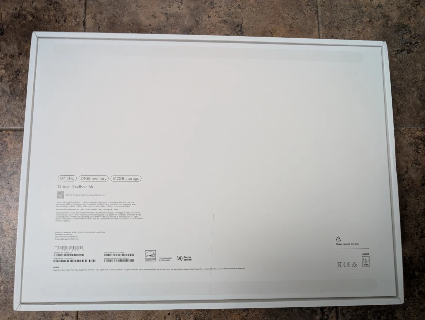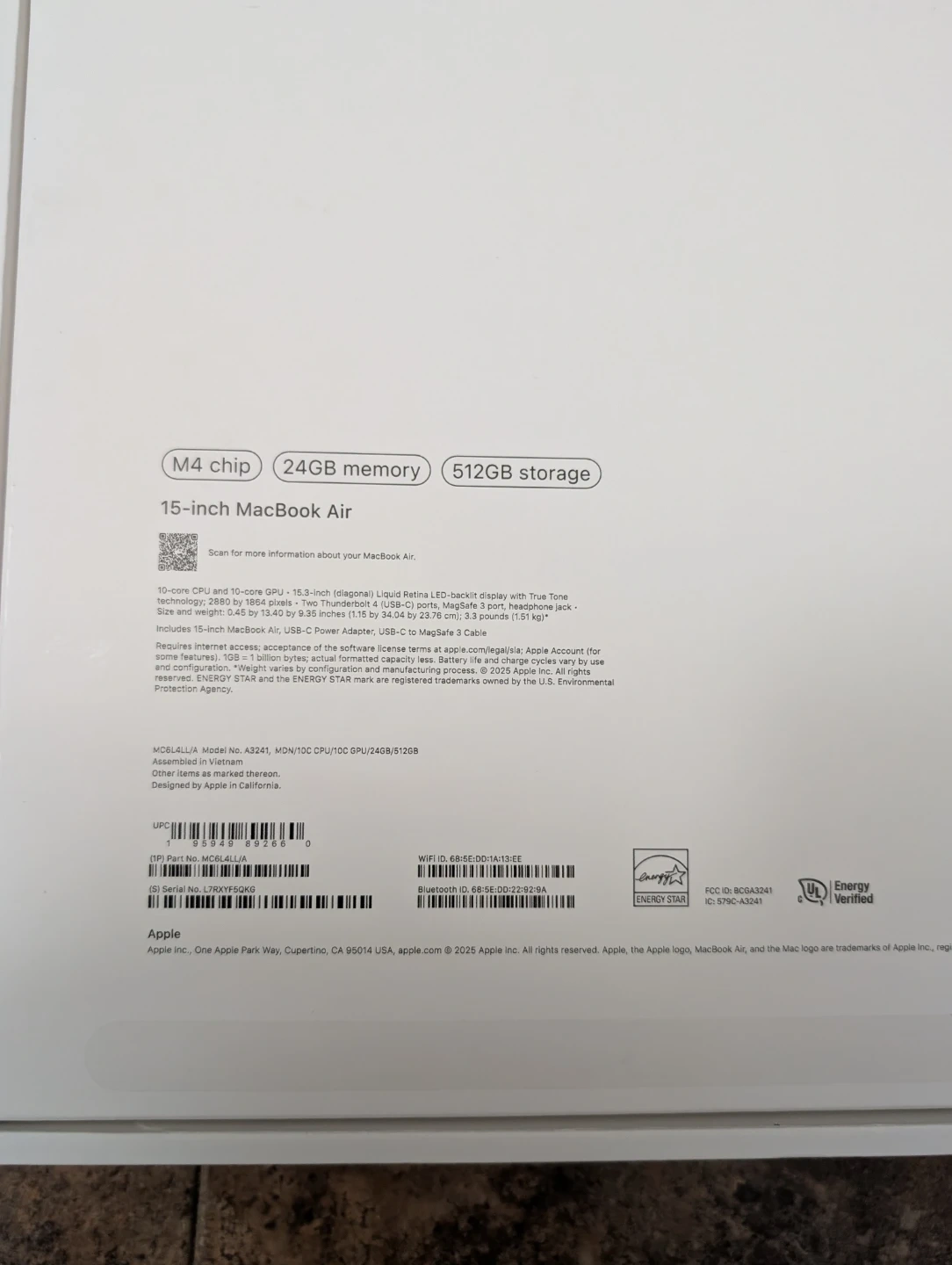 This is a 15-inch MacBook Air with an M4 chip. It comes with 24GB of memory and 512GB of storage. The dimensions are 13.40 by 9.35 inches by 0.45 inches (34.04 by 23.76 cm by 1.15 cm). The weight is 3.3 pounds (1.51 kg).
