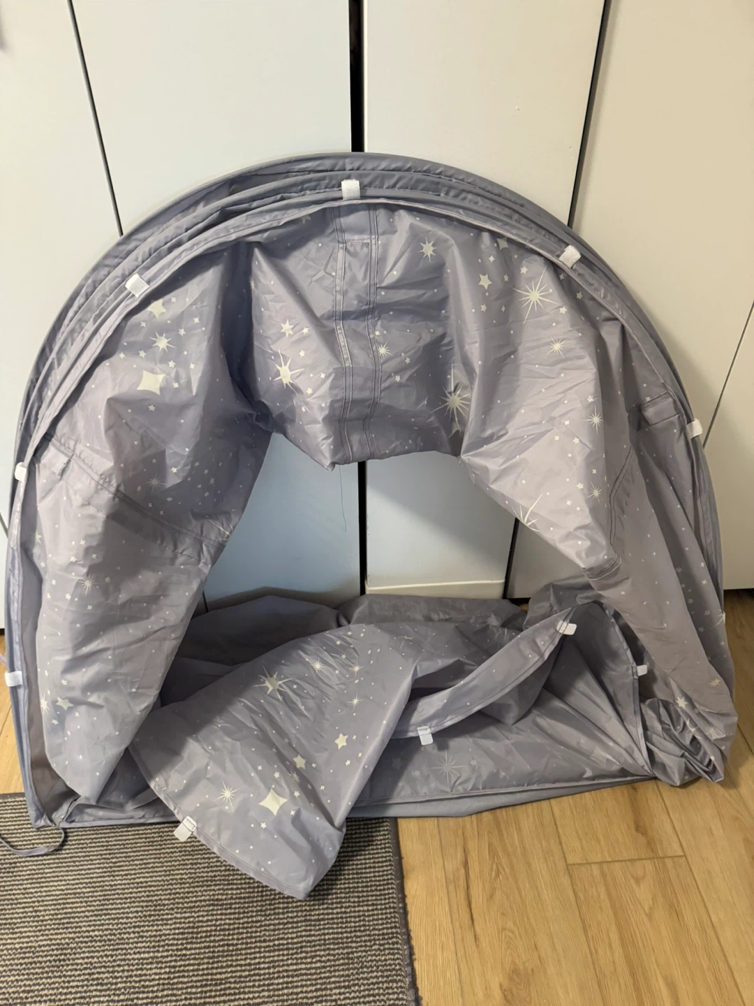 This AIRPORT Original Dream Form portable twin bed canopy's design features glow-in-the-dark stars. It's designed to fit a twin bed and provides a fun, enclosed space. Daylight will charge the glowing stars for a magical nighttime effect!