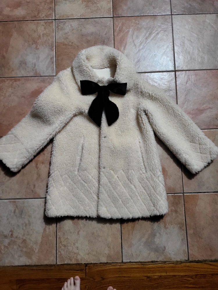 Adorable vintage teddy coat. Features a black velvet bow. Mid-length and warm. Classic style.