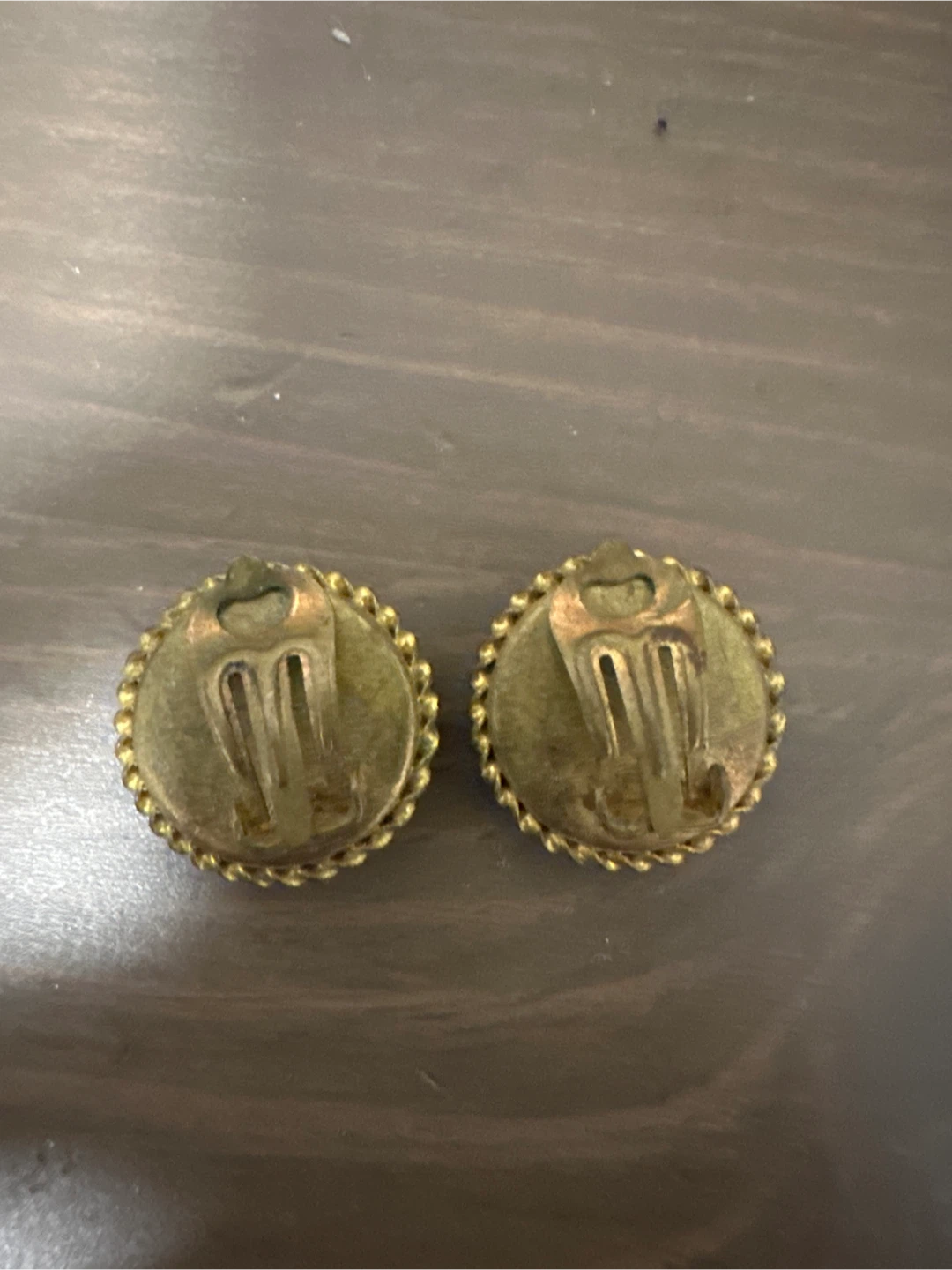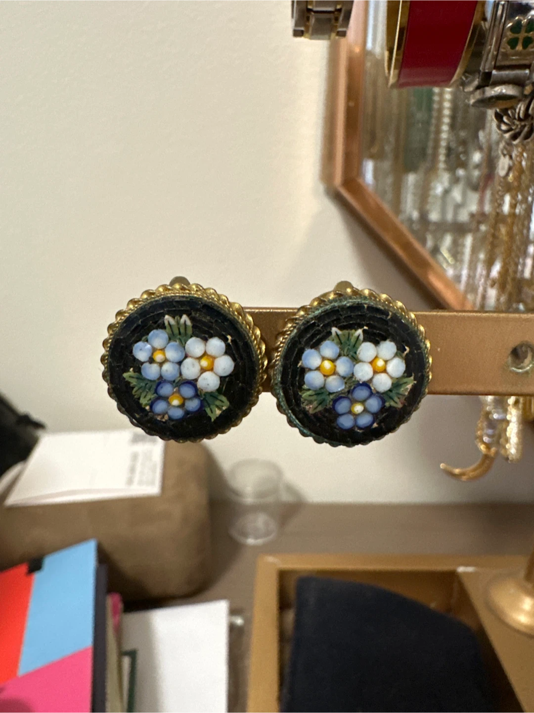 Selling a pair of vintage clip-on earrings! They feature a beautiful floral mosaic design with blue and white flowers on a black background, surrounded by a gold-tone braided edge. These are perfect for adding a touch of vintage charm to any outfit