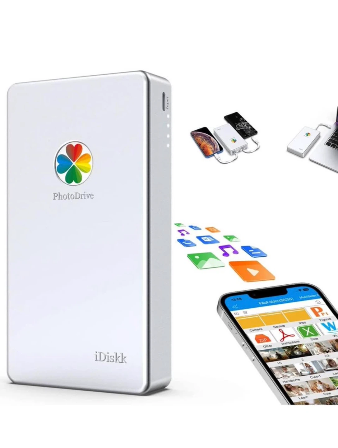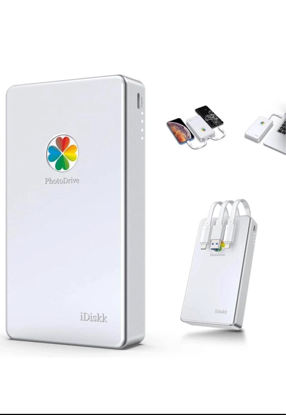 This iDiskk PhotoDrive offers 4TB of storage for photos, songs, and HD movies. It's Apple MFi Certified with one-tap auto backup and a built-in battery. Transfer data among various devices like iPhones, iPads, and PCs using its built-in 3 cables.