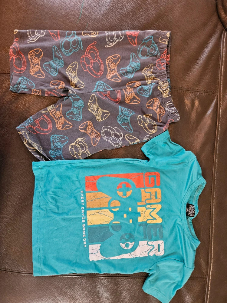 36Selling a cute Quad Seven matching set for kids! The set includes a turquoise t-shirt with a fun "Game On" design and gray shorts with a colorful gaming controller pattern. Size 7/8