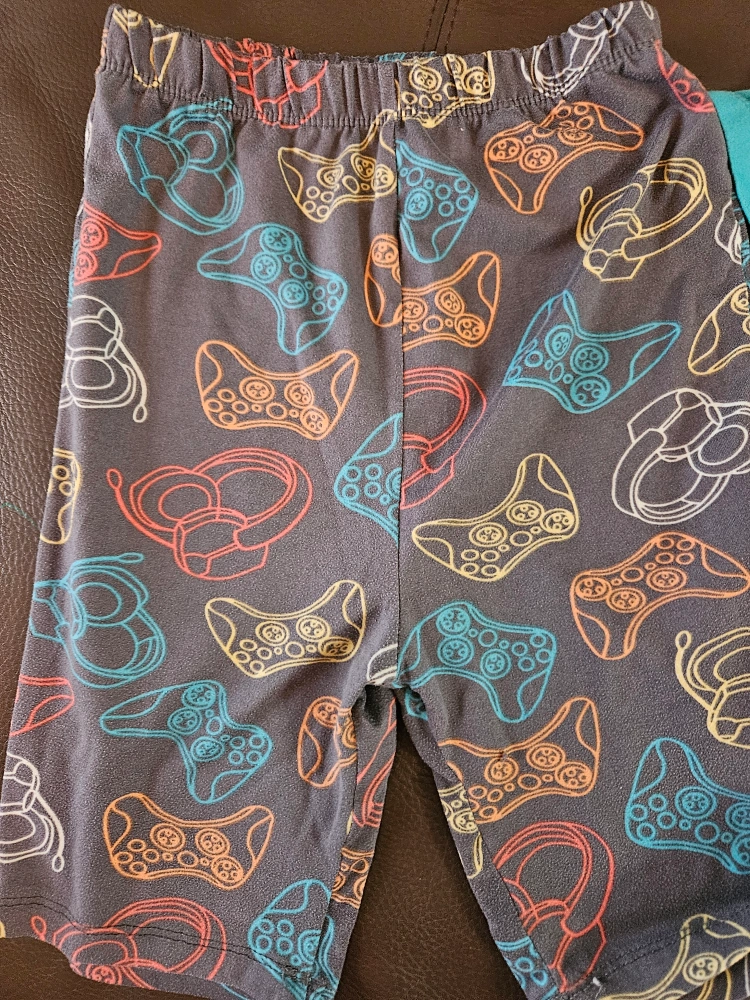 Selling a cute Quad Seven matching set for kids! The set includes a turquoise t-shirt with a fun "Game On" design and gray shorts with a colorful gaming controller pattern. Size 7/8