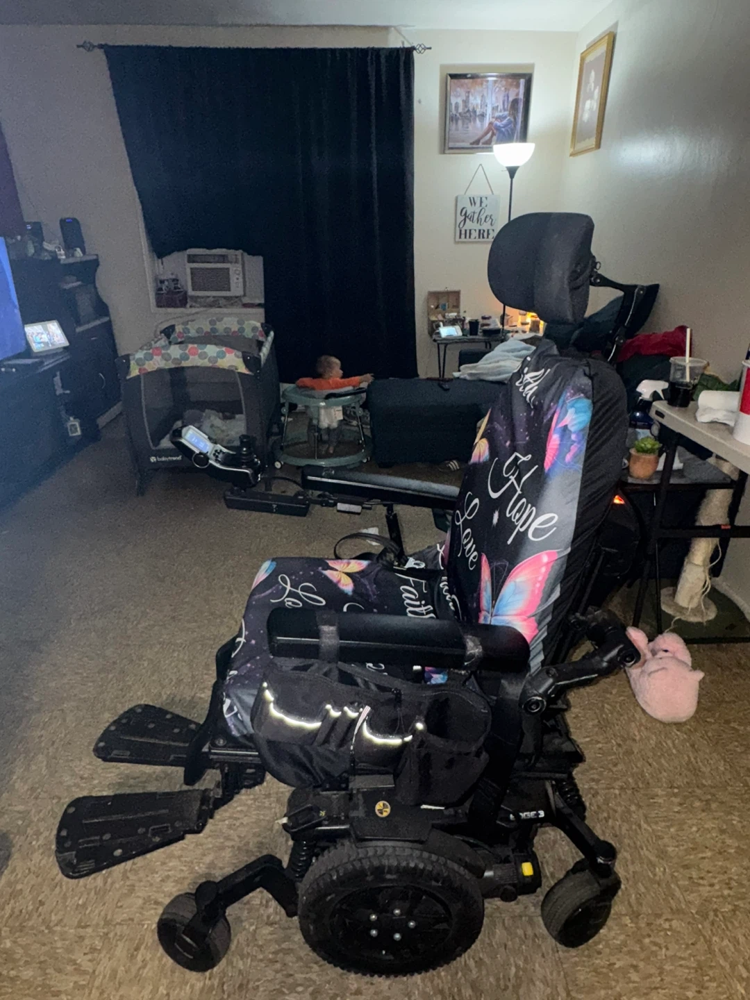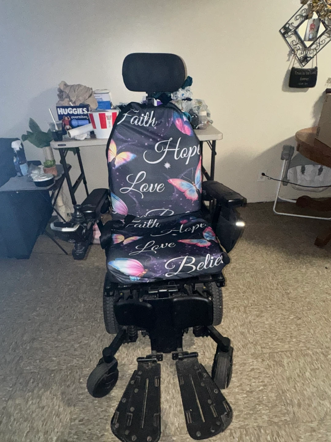Selling a Quantum Edge 3 power wheelchair. It features a custom seat and back cover with a faith, hope, love, and believe design. This chair is designed for mobility and comfort, making it a great option for anyone in need of a reliable power wheelchair