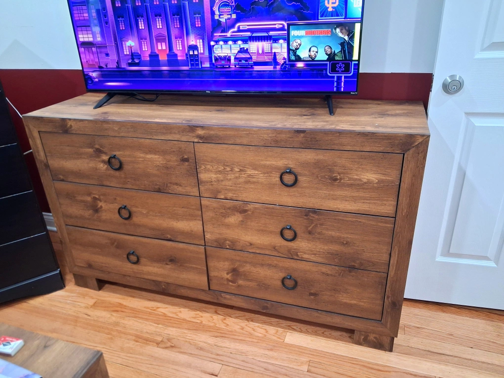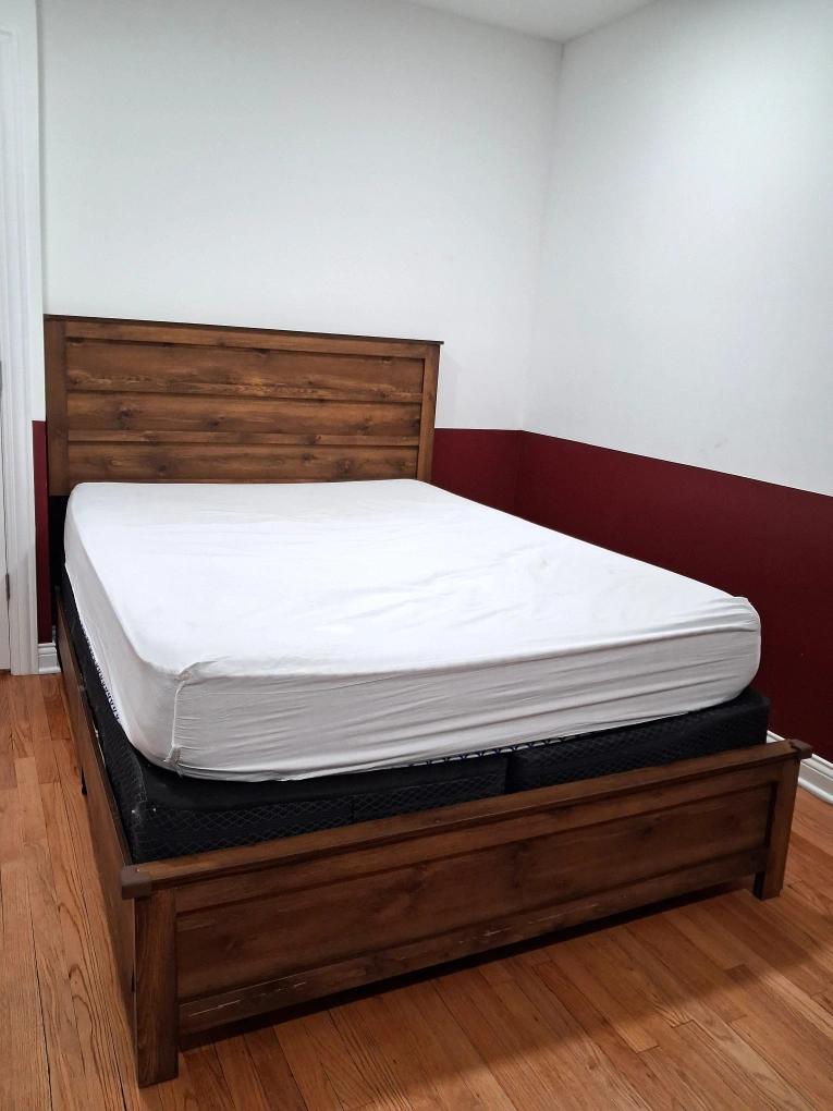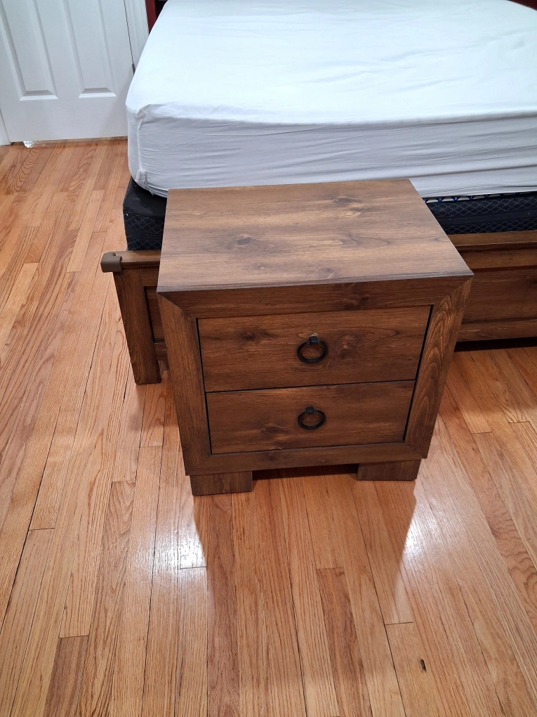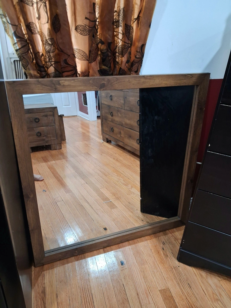 Selling a bedroom set that includes a bed frame, a dresser with six drawers, a nightstand with two drawers, and a mirror. All pieces are made of wood and have a matching design. They are in good condition!
