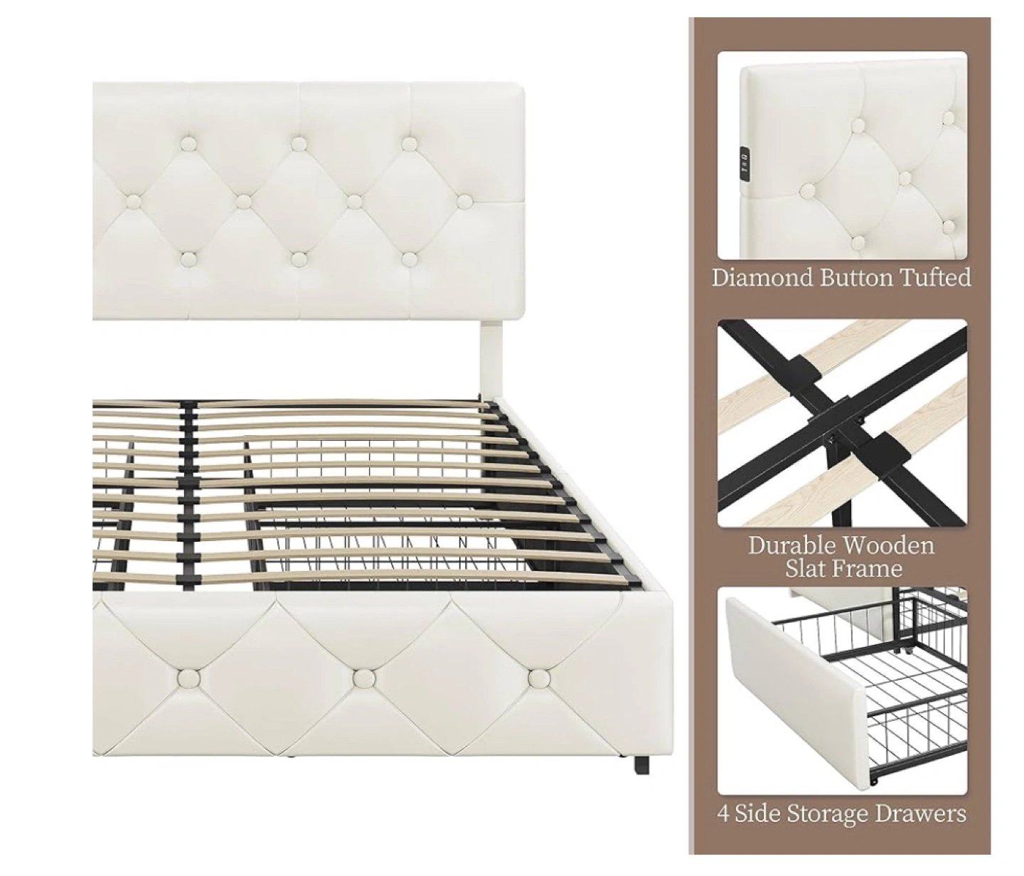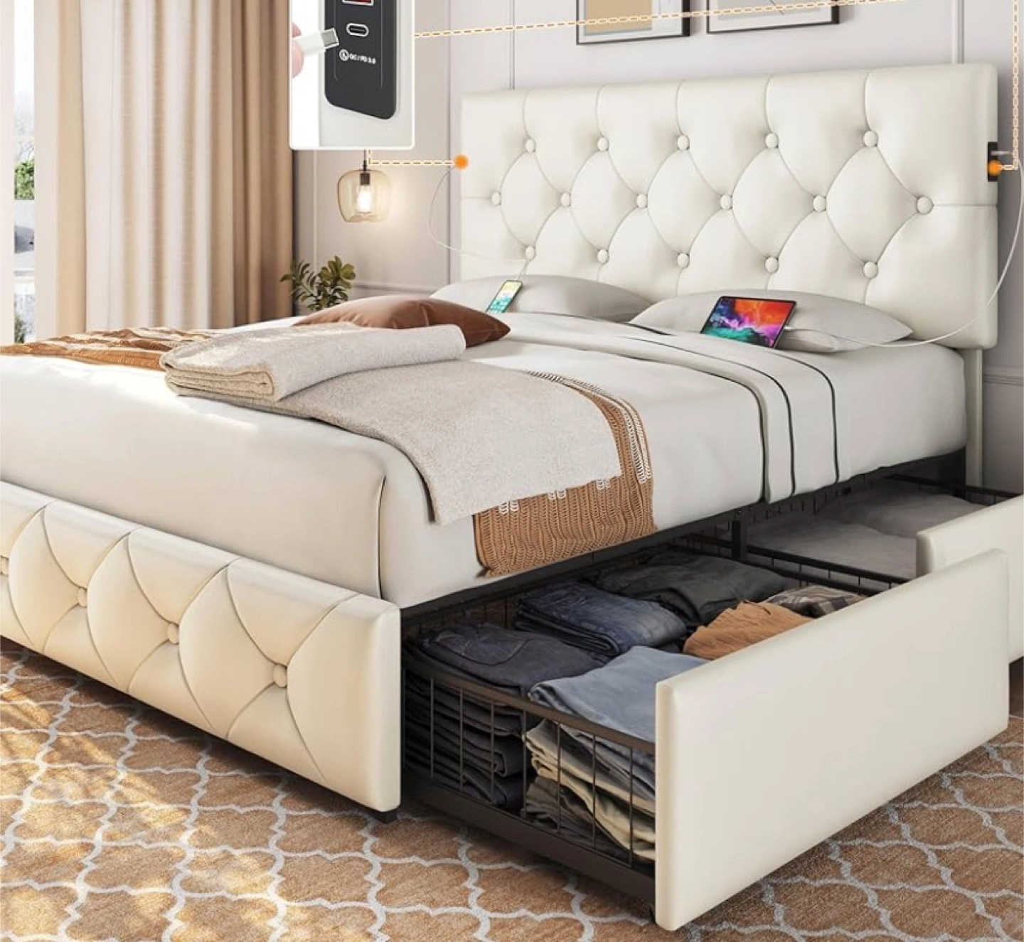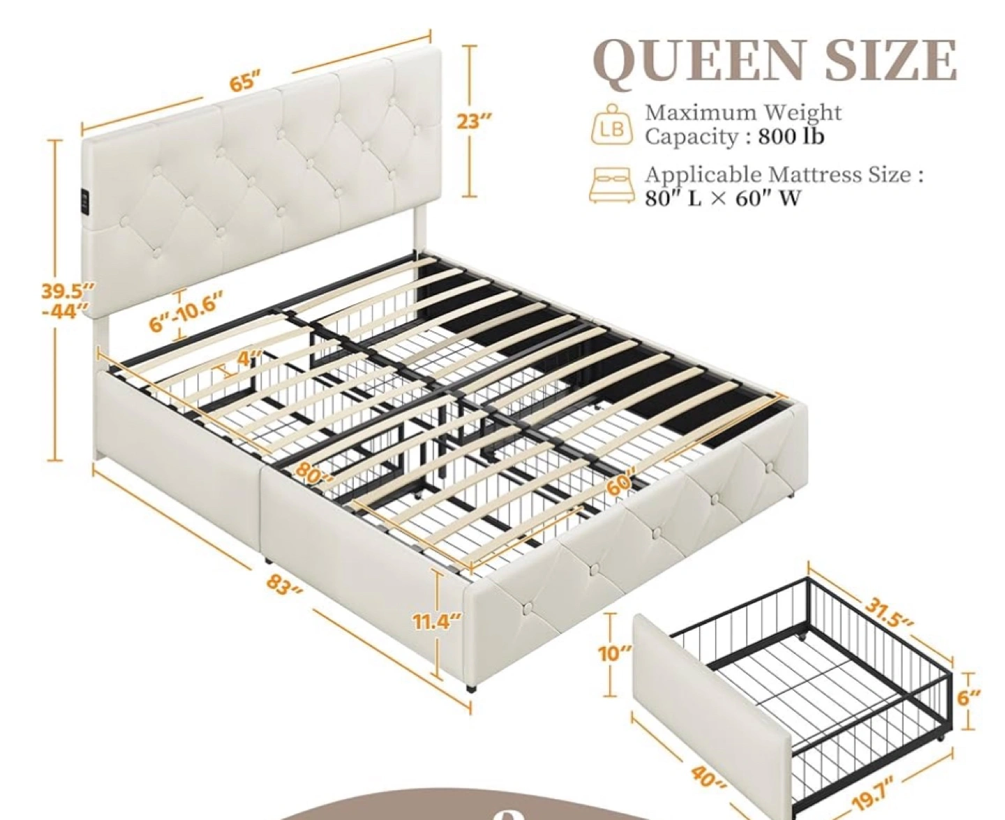 134Queen Size Upholstered Bed Frame with 2 USB Charging Stations/Ports for Type A & Type C/. It has 4 storage drawers. Upholstered with beige leather. No Box Spring Needed. Very functional. Used for less than a year. 180$.