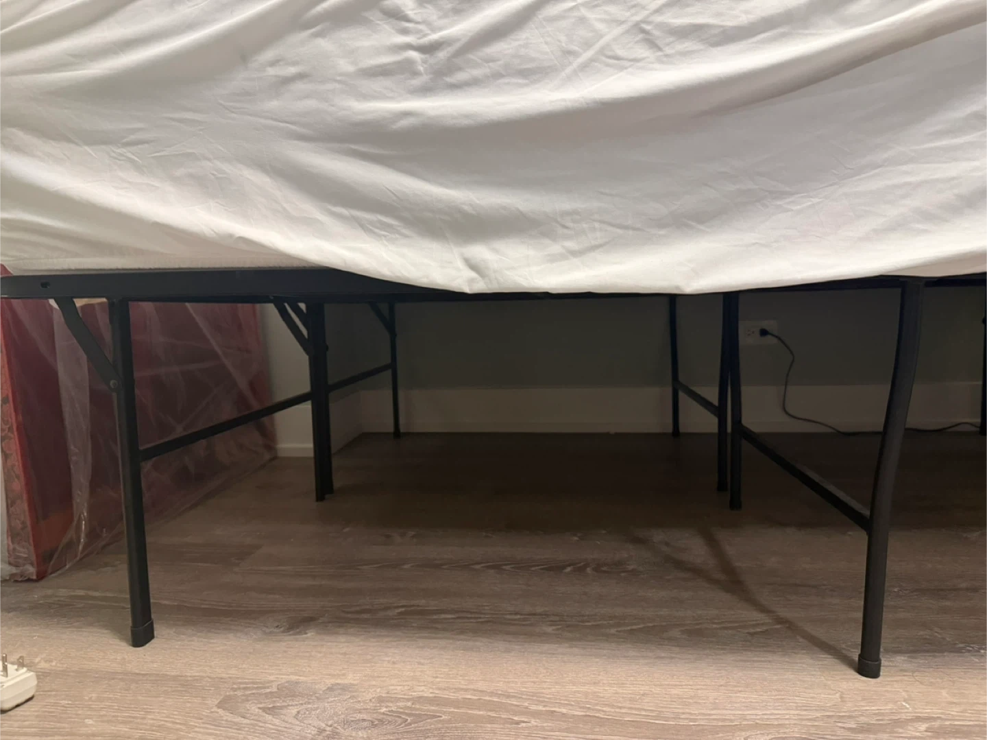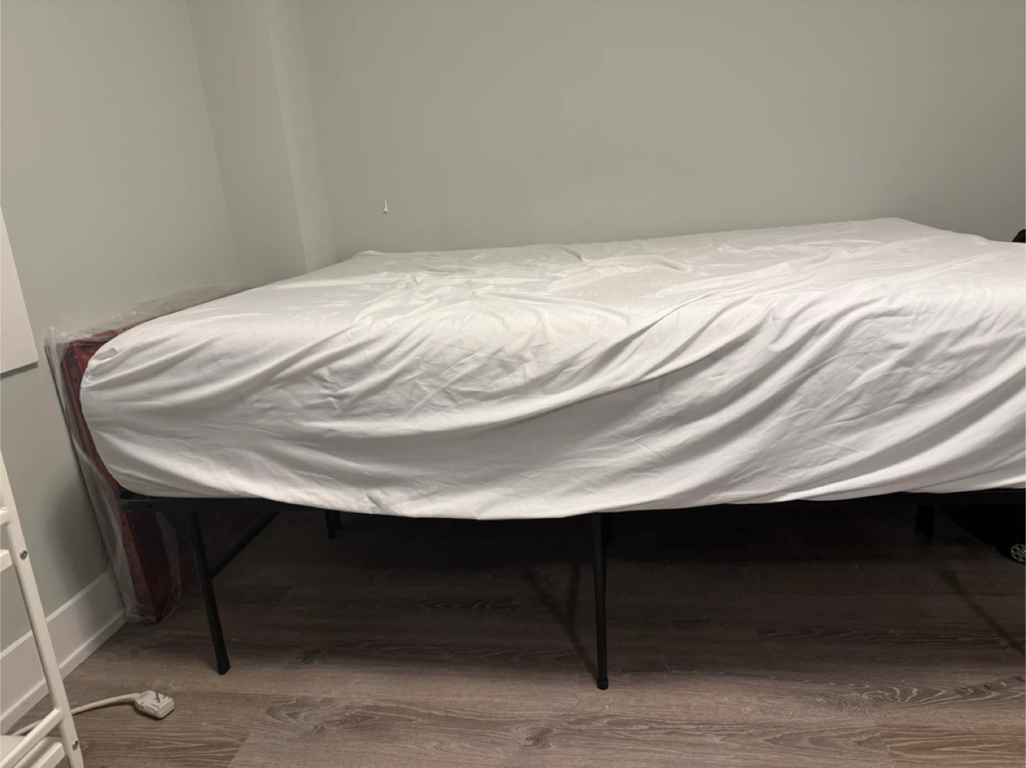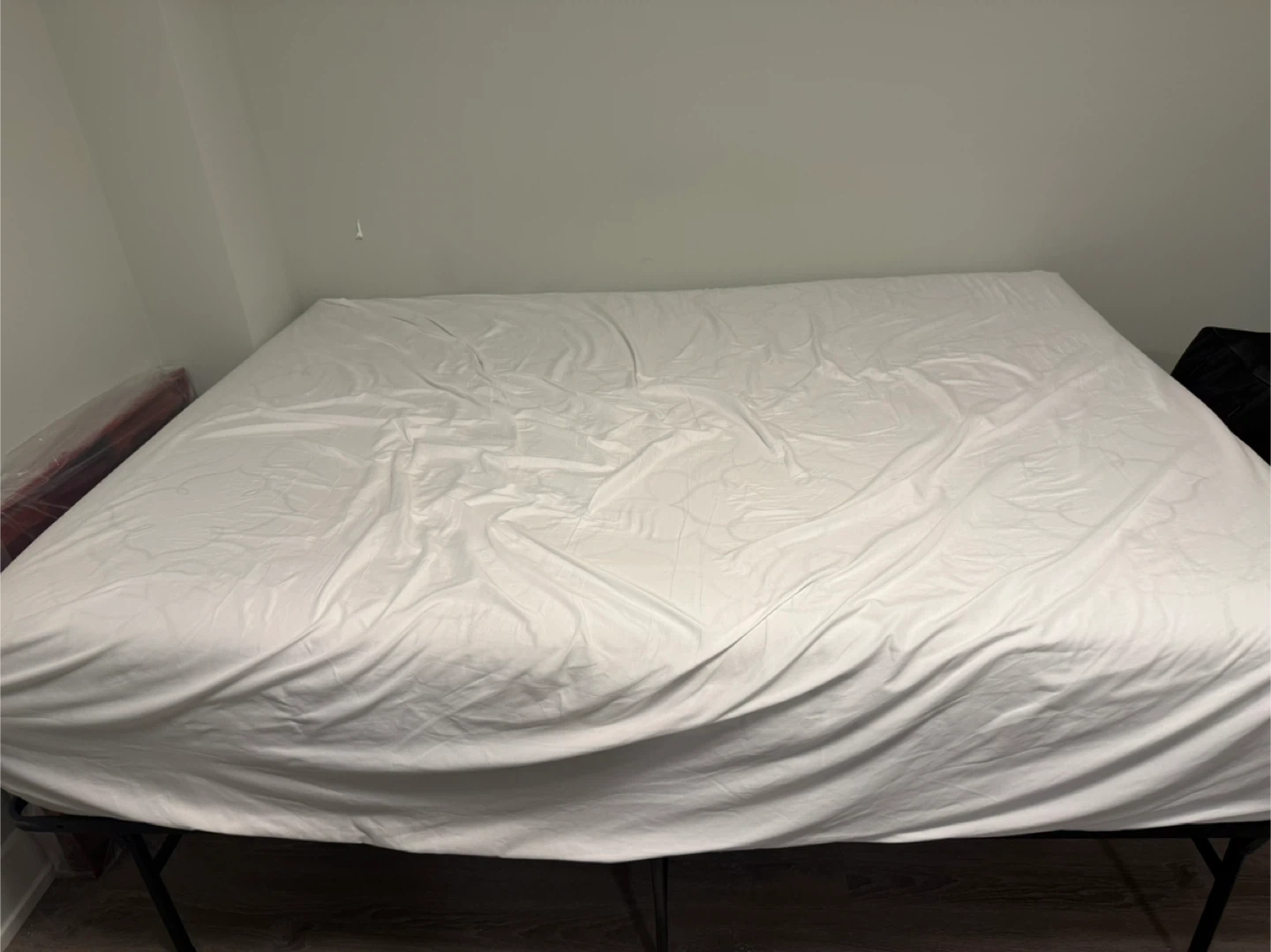 68Selling a queen size bed with a black metal frame. It's in great condition and ready for a new home! Used it only for two month. The sturdy frame is easy to assemble and provides excellent support for your mattress :) Also, you can put your stuff under the bed! Price is negotiable.