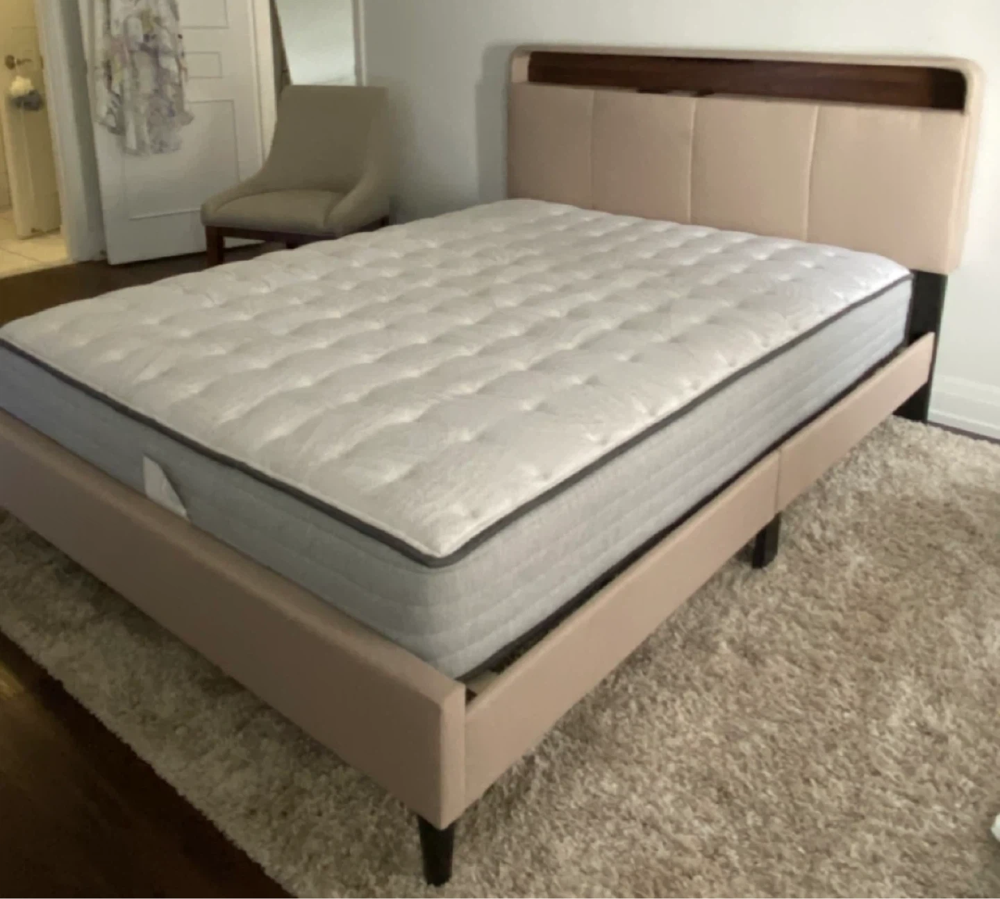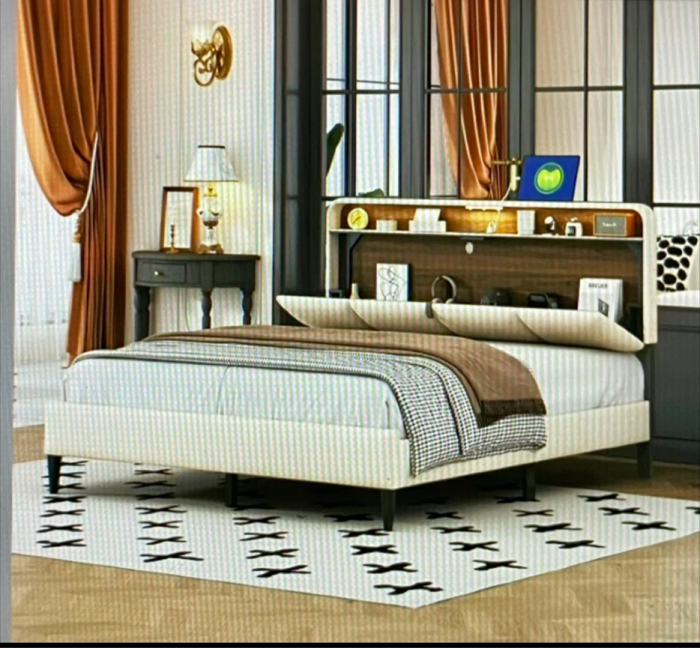37Selling a queen size modern upholstered platform bed frame. It features a storage headboard design with sensor light, and a set of sockets and USB ports. Beige color. Perfect for adding both style and functionality to your bedroom. Almost new and provides excellent support. Mattress sold separately. A stylish and practical addition to any bedroom!