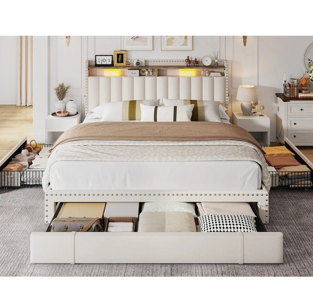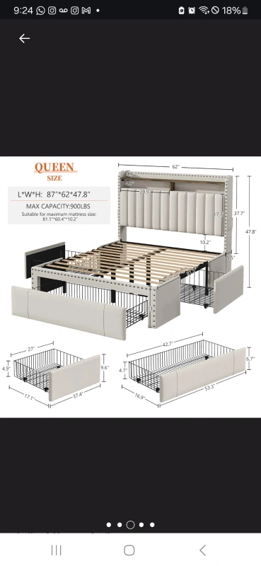 Selling a queen size bed frame with built-in storage! It features a headboard with a shelf and LED lighting. The frame also includes drawers underneath for extra storage space. Dimensions: - L*W*H: 87" * 62" * 47.8" - Suitable for mattress size: 81.1" * 60.2" * 10.2" - Max capacity: 900 lbs