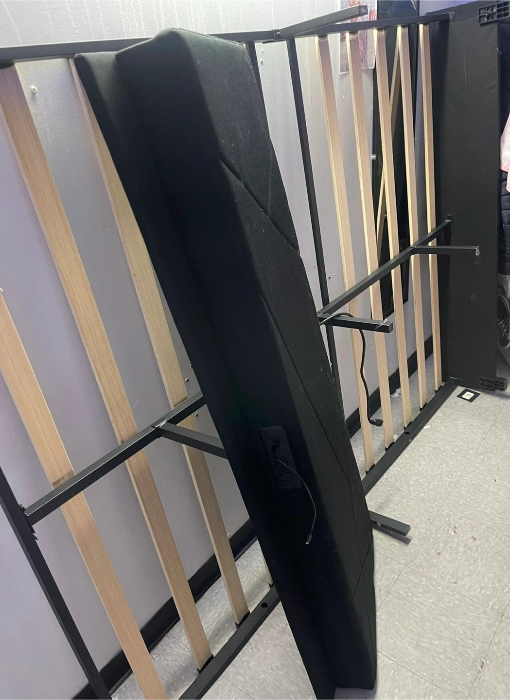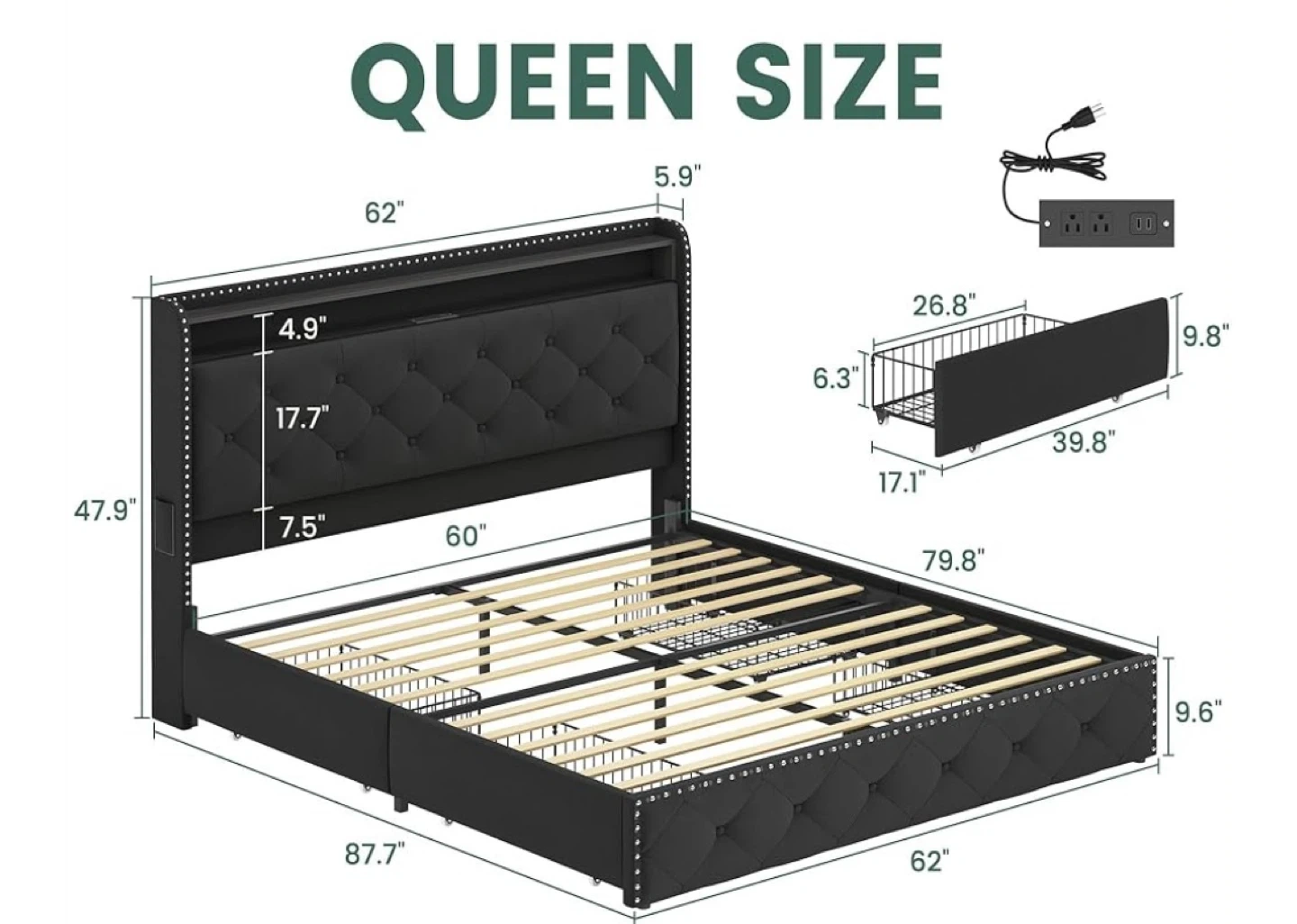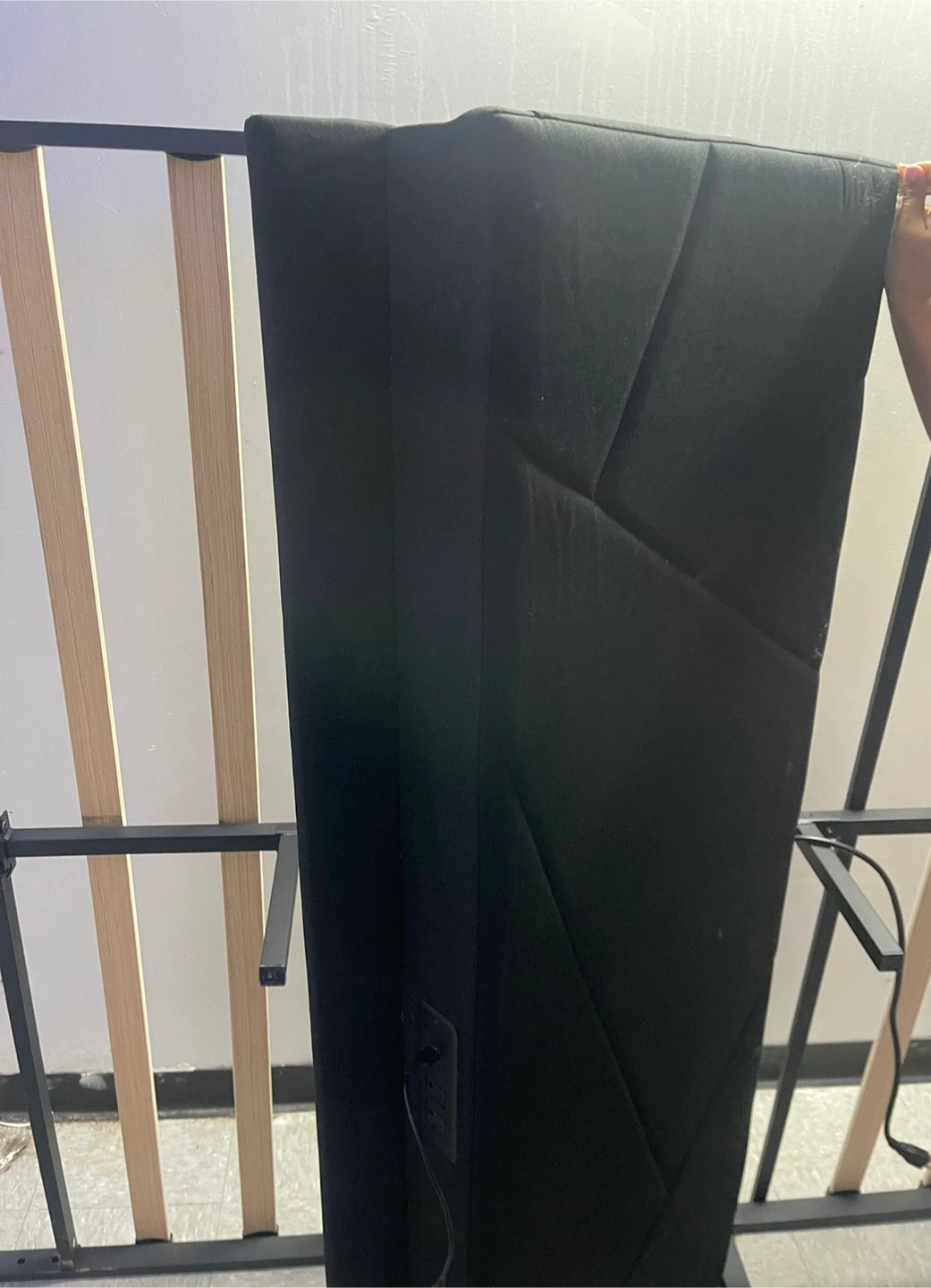 Selling a queen size platform bed frame. It features a black upholstered headboard with a geometric design. The frame includes wooden slats for support and a black metal frame. It also has built-in outlets on the side of the headboard. Queen size velvet upholstered bed frame with storage and charging station. It’s complete & the bed had 2 drawers.