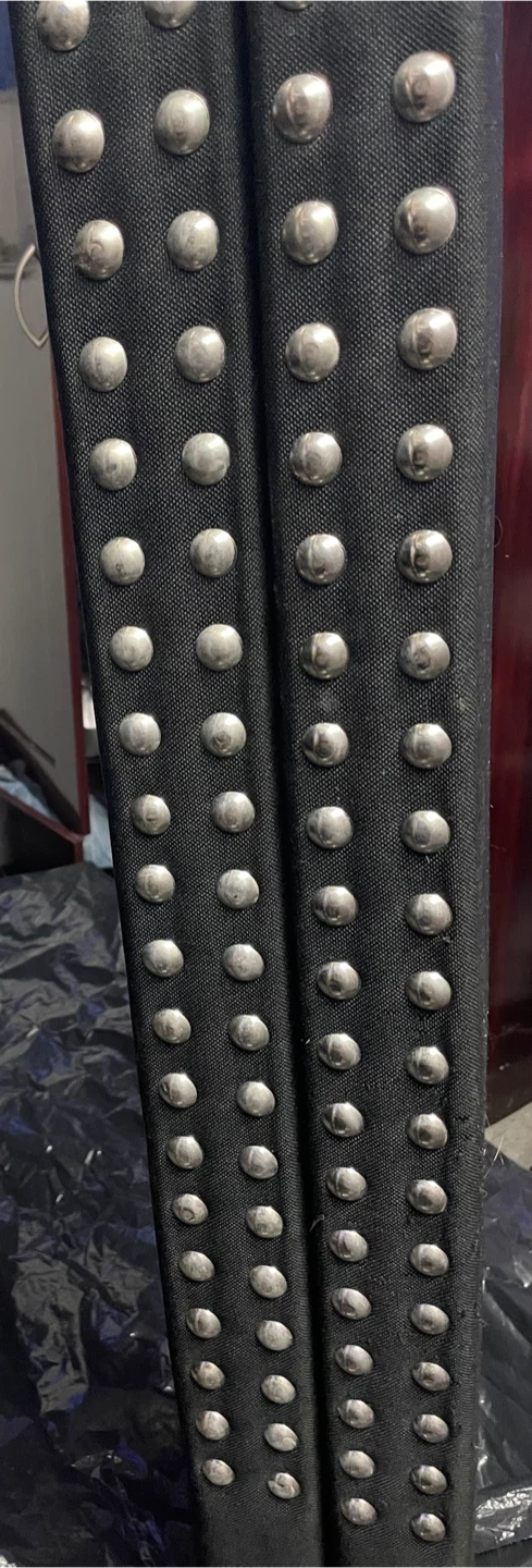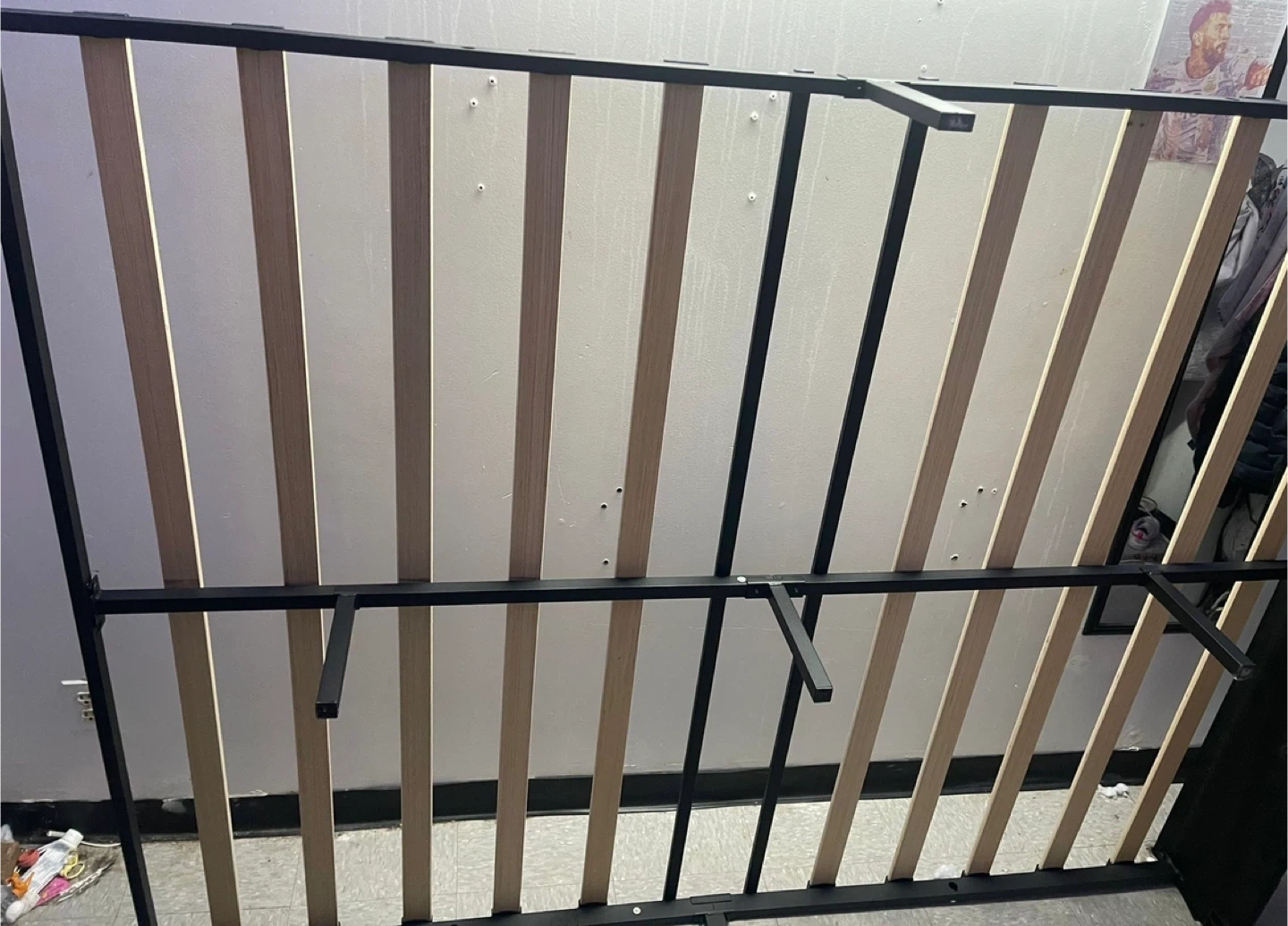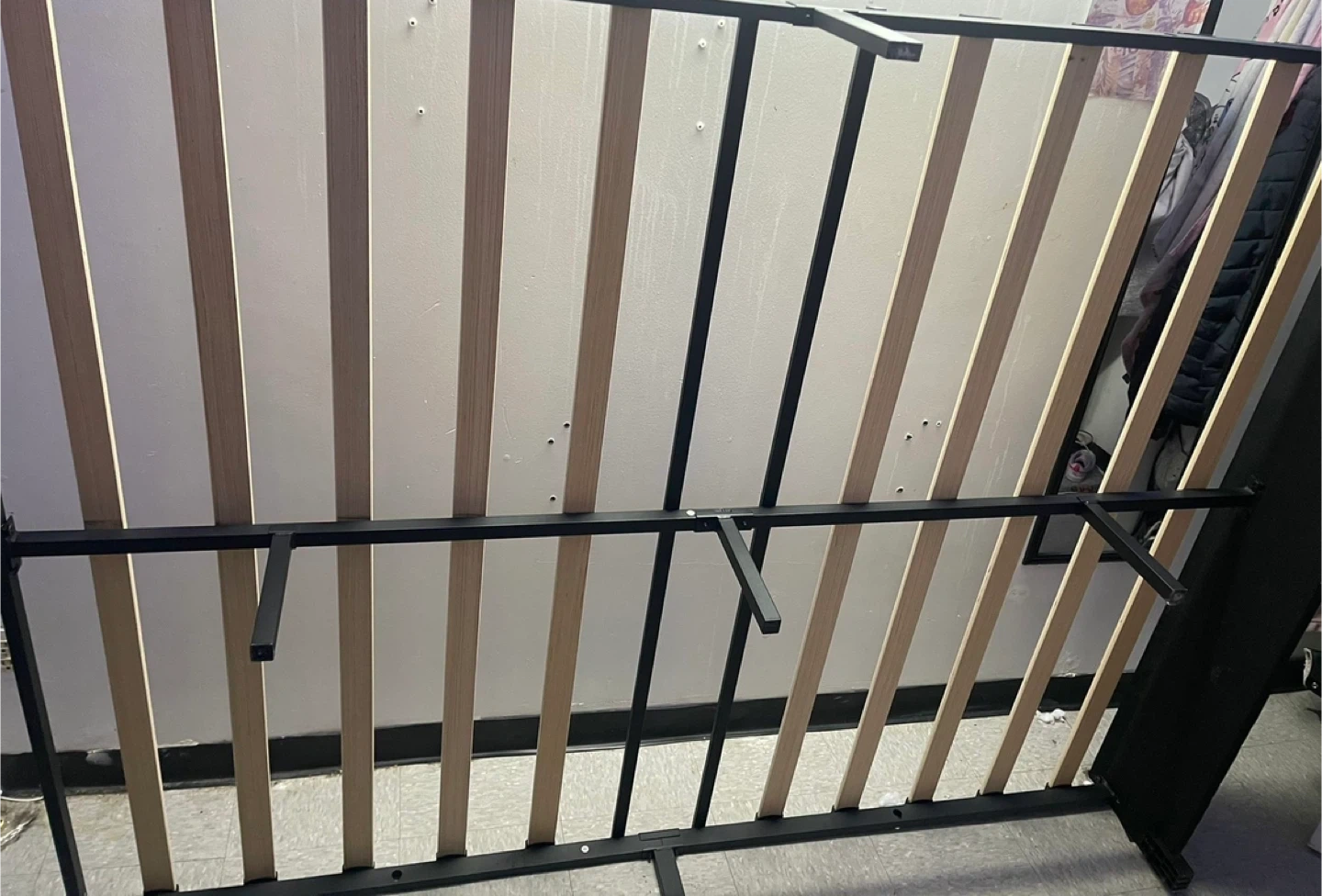Selling a queen size platform bed frame. It features a black upholstered headboard with a geometric design. The frame includes wooden slats for support and a black metal frame. It also has built-in outlets on the side of the headboard. Queen size velvet upholstered bed frame with storage and charging station. It’s complete & the bed had 2 drawers.