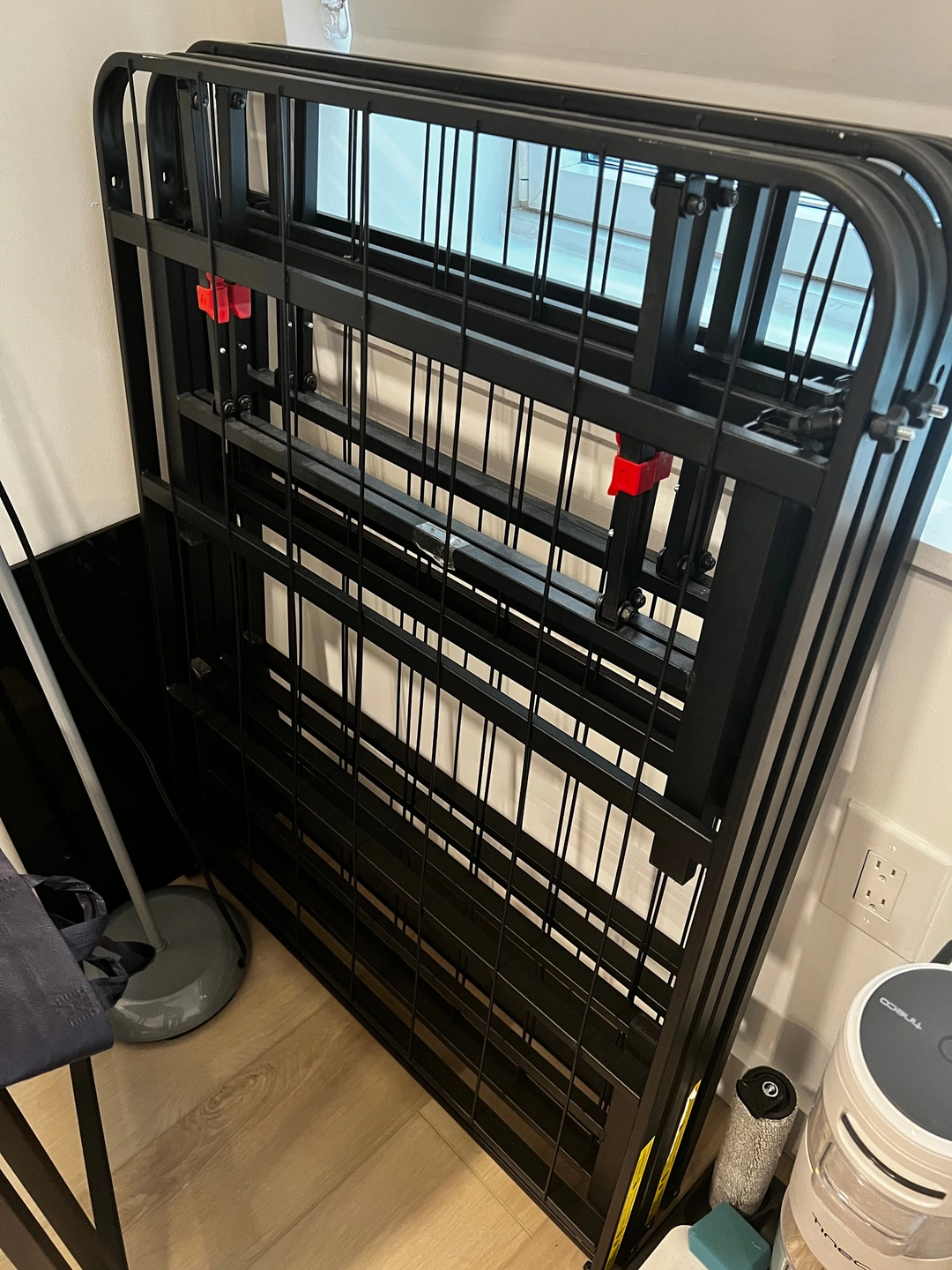 10This queen-size foldable platform bed frame is built for strength, storage, and convenience. Crafted from durable steel, it provides excellent mattress support with no box spring required. The elevated 14-inch design creates ample under-bed storage space—perfect for keeping your room organized. Features: Size: Queen Color: Black Material: Sturdy steel construction Weight Capacity: Supports up to 700 lbs (350 lbs per person) Design: Noise-free, supportive foundation keeps mattress in place Setup: Tool-free, easy folding mechanism for quick assembly and storage Condition: Excellent, gently used Ideal for apartments, guest rooms, or anyone who wants a strong, space-saving bed frame with easy portability.
