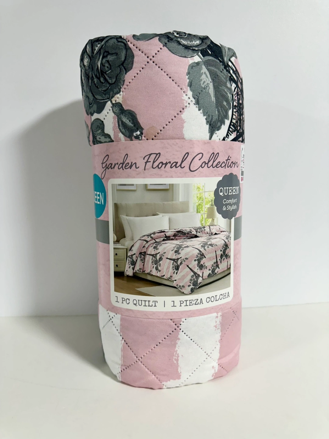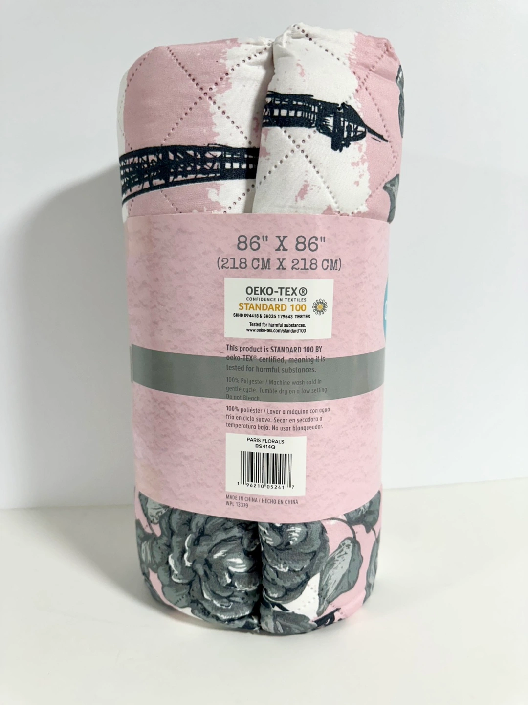 New queen size quilt. Pink and gray floral pattern. 86" x 86". Soft and comfortable. Machine washable.