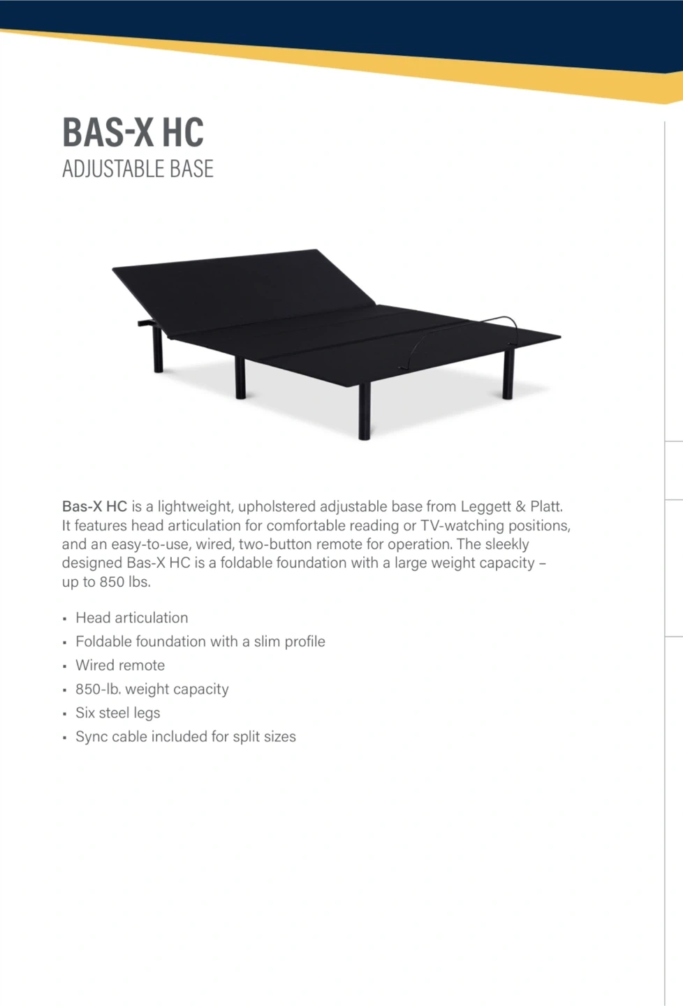 15Motion Control 850 lbs. total max weight capacity Head articulation Base Control Wired 2-button remote Sync cable included with split sizes Frame Black upholstery Zero clearance, slat bed and platform bed-friendly Folding, slim profile foundation style design Steel legs, for optional use Original price $550+ tax
