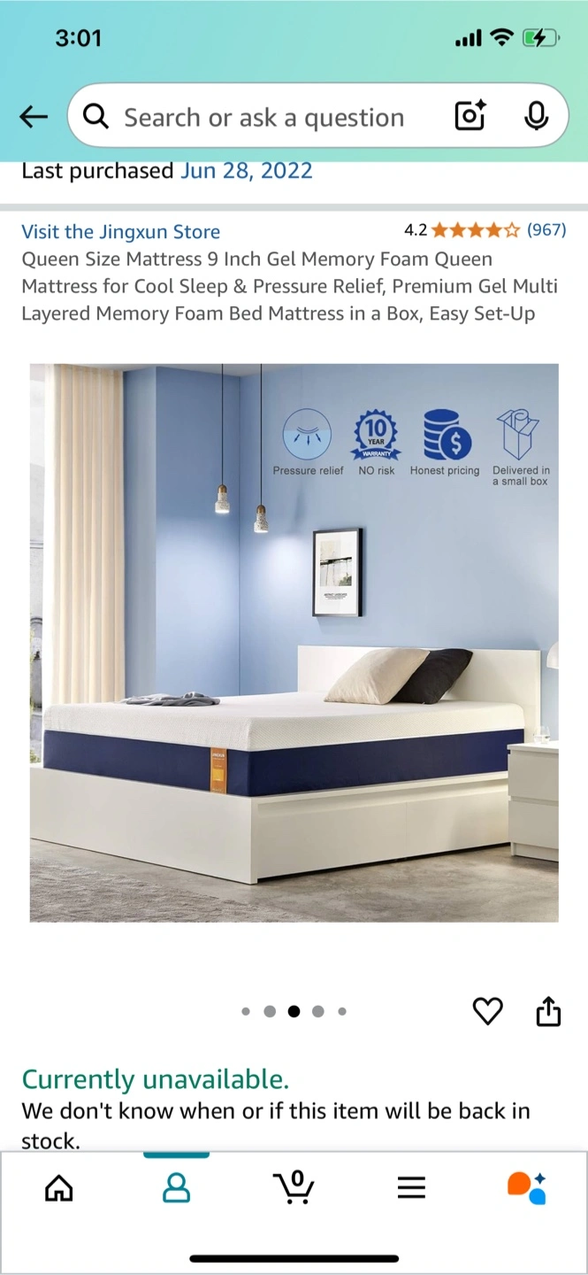 107Selling a 9-inch gel memory foam mattress, comes with a 10 year warranty. Originally $300+, selling for $75 OBO Used for 2ish with a mattress protector so it’s basically brand new (pictured). I’m moving out of state and can’t fit it in the car