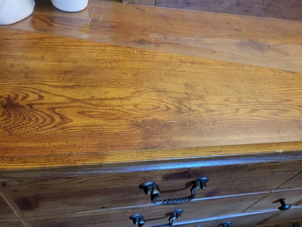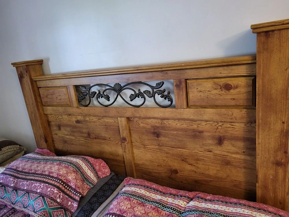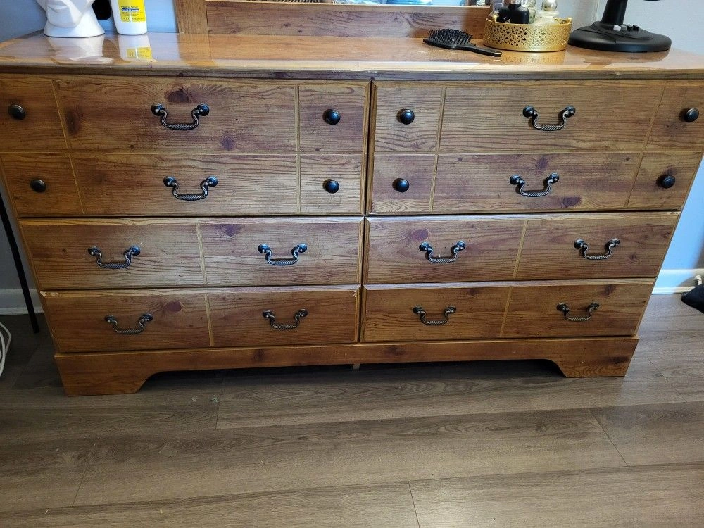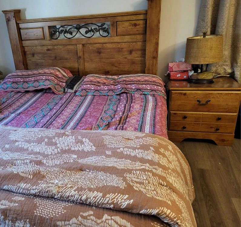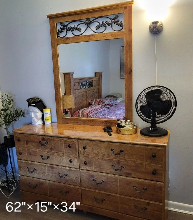 88Queen solid wood bedroom set includes bed, dresser with mirror, and one night stand. Firm, sturdy, real wood, and very spacious. Dimentions are given in the pictures. Minior scraches cannot see from far at all. Night stand has one white stain shown in the picture. Selling at $800.