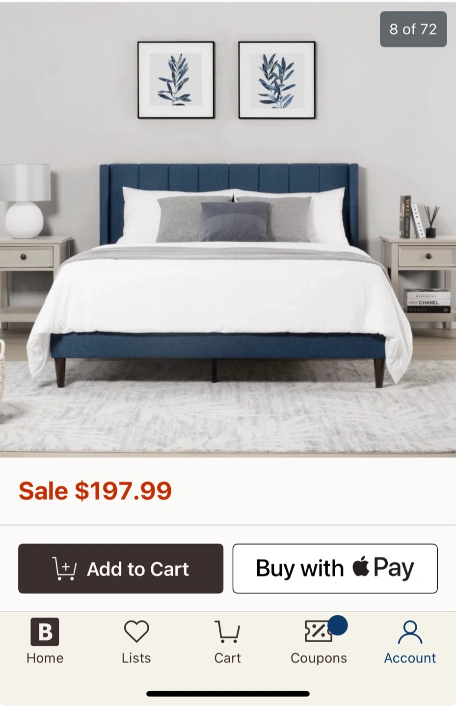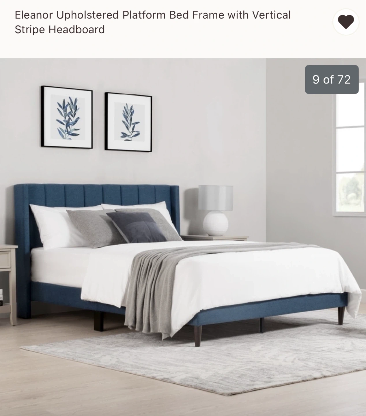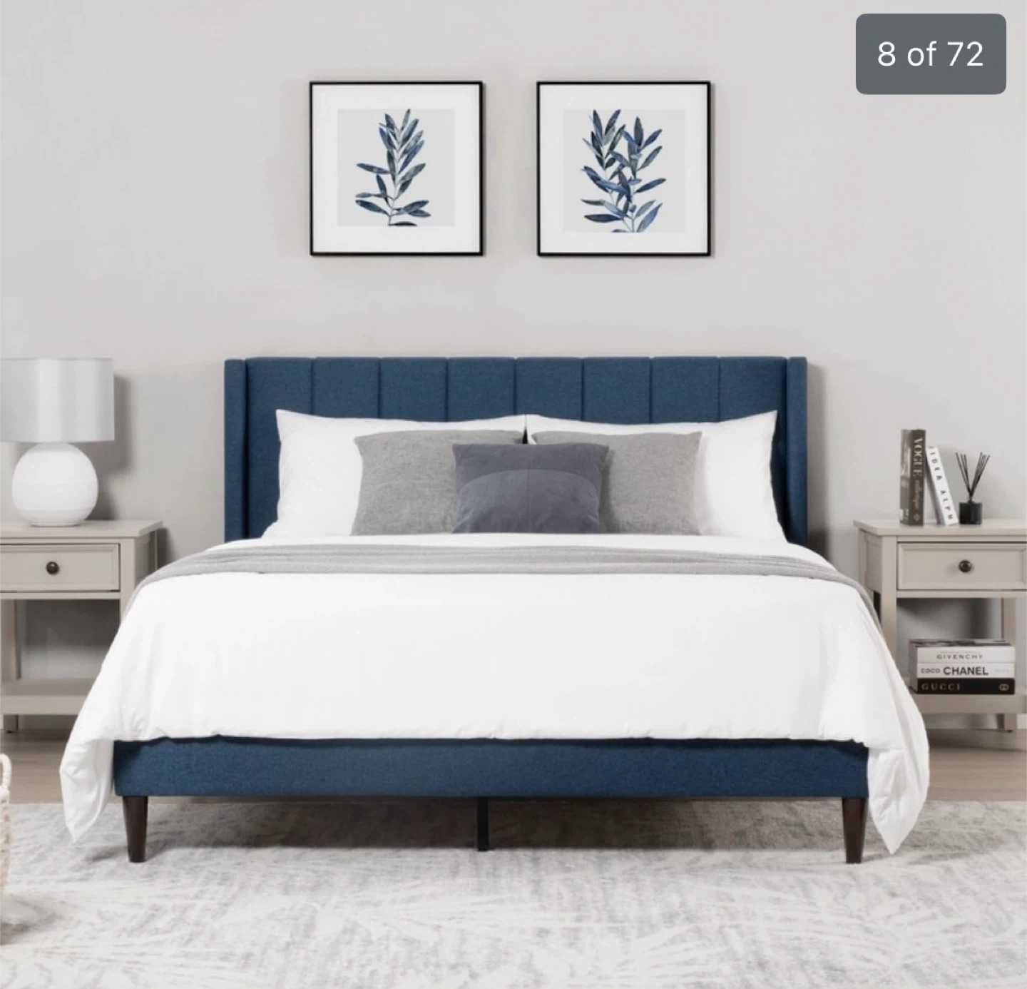 New, never assembled, in original box. Pickup from 2nd floor apartment. Recommend 2 people pickup bed due to weight of box. Mixing iconic mid-century modern details and traditional design, the Brady Upholstered Wingback Platform Bed (BLUE) is a stunning bedroom focal point. Tapered legs enhance the mid-century vibe, while classic bed wings add dimension and prevent mattress sliding. The wood slat support system accommodates various mattress types and reduces noise with Velcro-secured slats and mute bars. Key Features: -Fully upholstered with foam padding for a soft touch -Wingback headboard features a channel-tufted pattern -Velcro design helps secure the bed slats in place. -Noiseless wood slat support system -9 points of contact with the floor to enhance stability -Heavy-duty steel & wood frame  -Bed legs are 6 inches high, providing storage space underneath. -The bed slat spacing is 3.1 inches, eliminating the need for a box spring. Easy-to-follow instructions included. Simple assembly can be completed within 30 minutes Weight capacity 800 pounds Mattress, box spring, and bedding (comforter, sheets, pillows, etc.) are NOT included.
