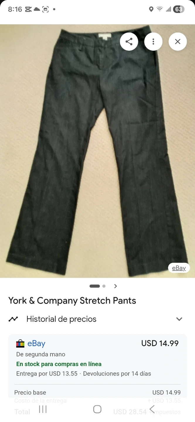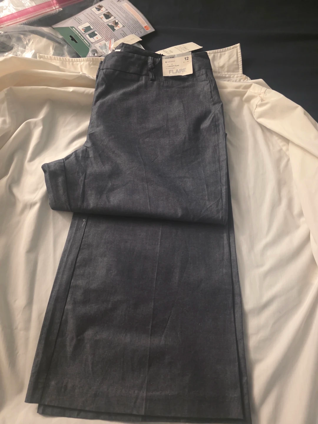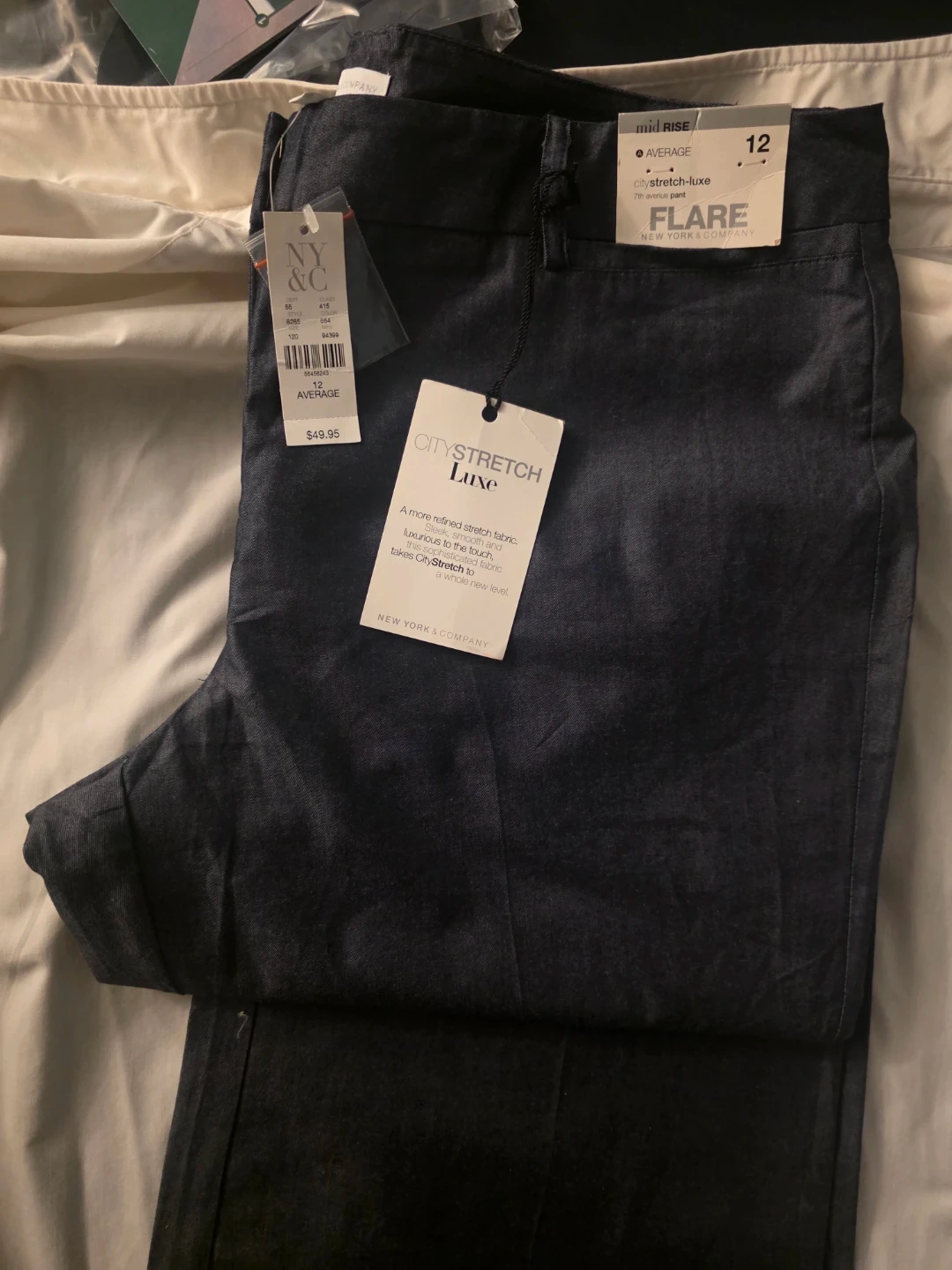 These are new York & Company City Stretch Luxe flare pants. They're a size 12 with a mid-rise fit. The fabric is a refined stretchy blend for a comfortable feel.