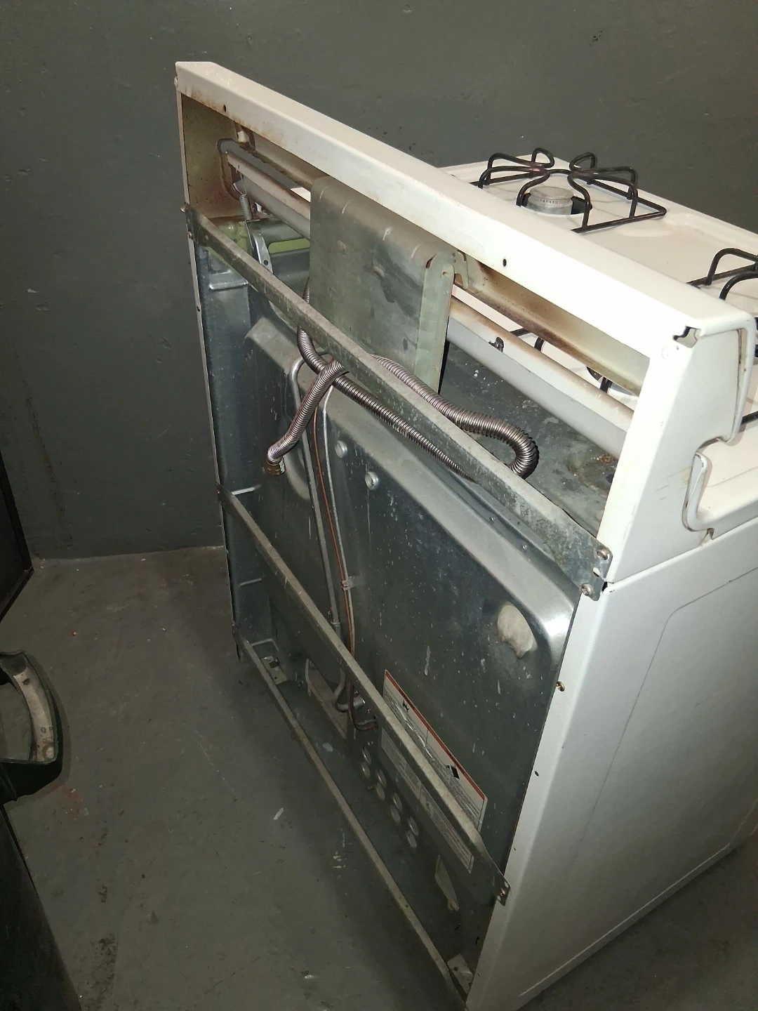 This is a white Whirlpool 4-burner gas stove with an oven. It features a standard cooktop with four burners and an oven with two racks inside. Perfect for everyday cooking needs!