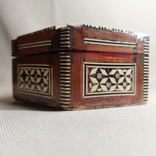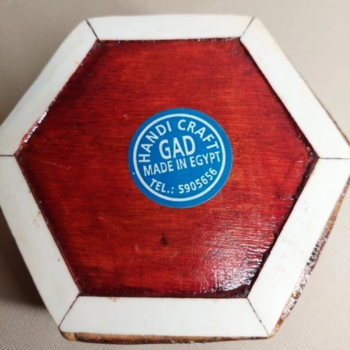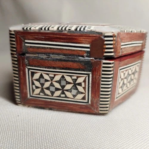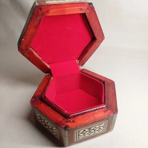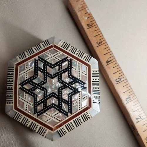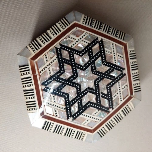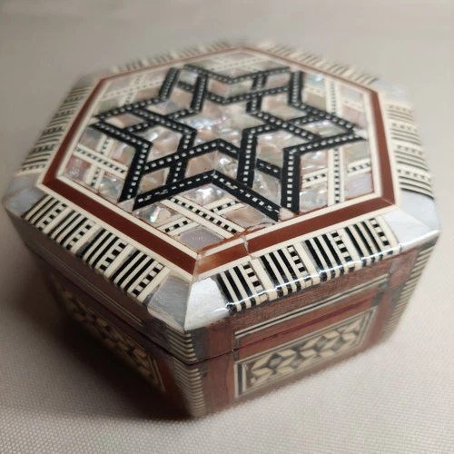 Egyptian Inlaid Wooden Jewelry Box Mother of Pearl Mosaic Hexago