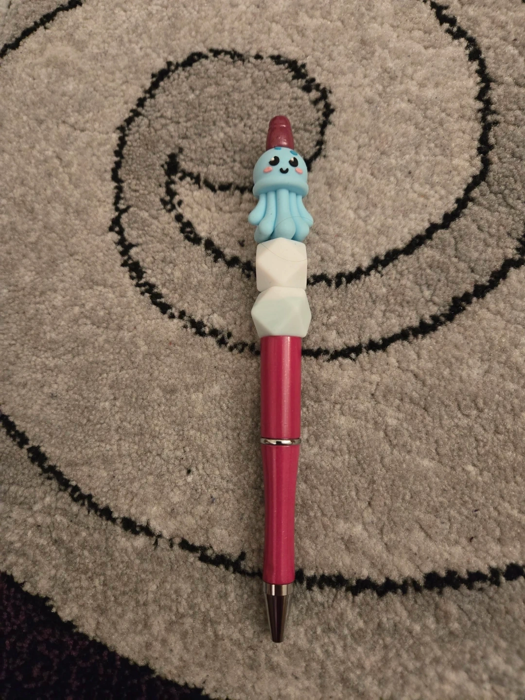 This fun pen features a cute blue octopus charm at the top with colorful beads. It has a vibrant pink barrel. Great for journaling or adding a bit of flair to your everyday writing!