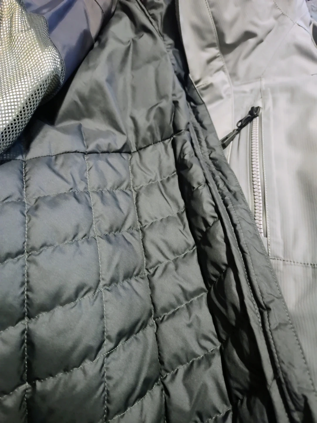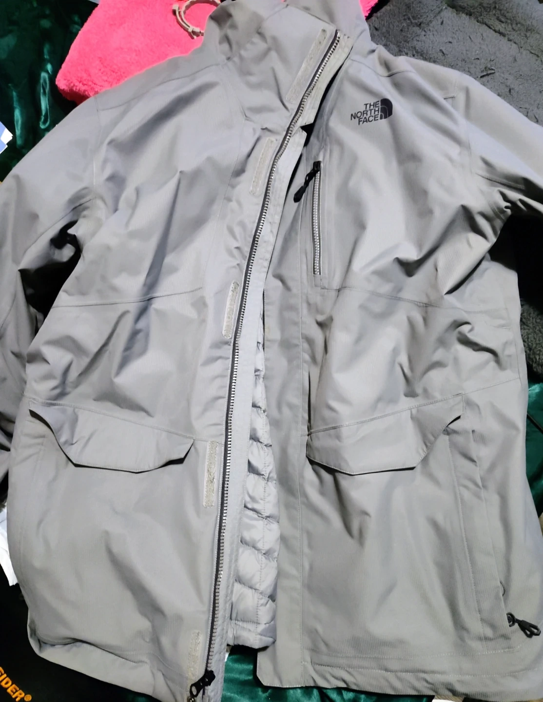 ***Mint Condition,like new**This is a men's double-layer North Face jacket from The North Face. It's a stylish grey color and features a quilted inner lining for warmth. Multiple zippered pockets provide secure storage for your essentials. The layer can be worn separately, the inner layer is reversible, with black on one side and grey on the other. The outer shell can be used as a raincoat on rainy days. Together on colder Days