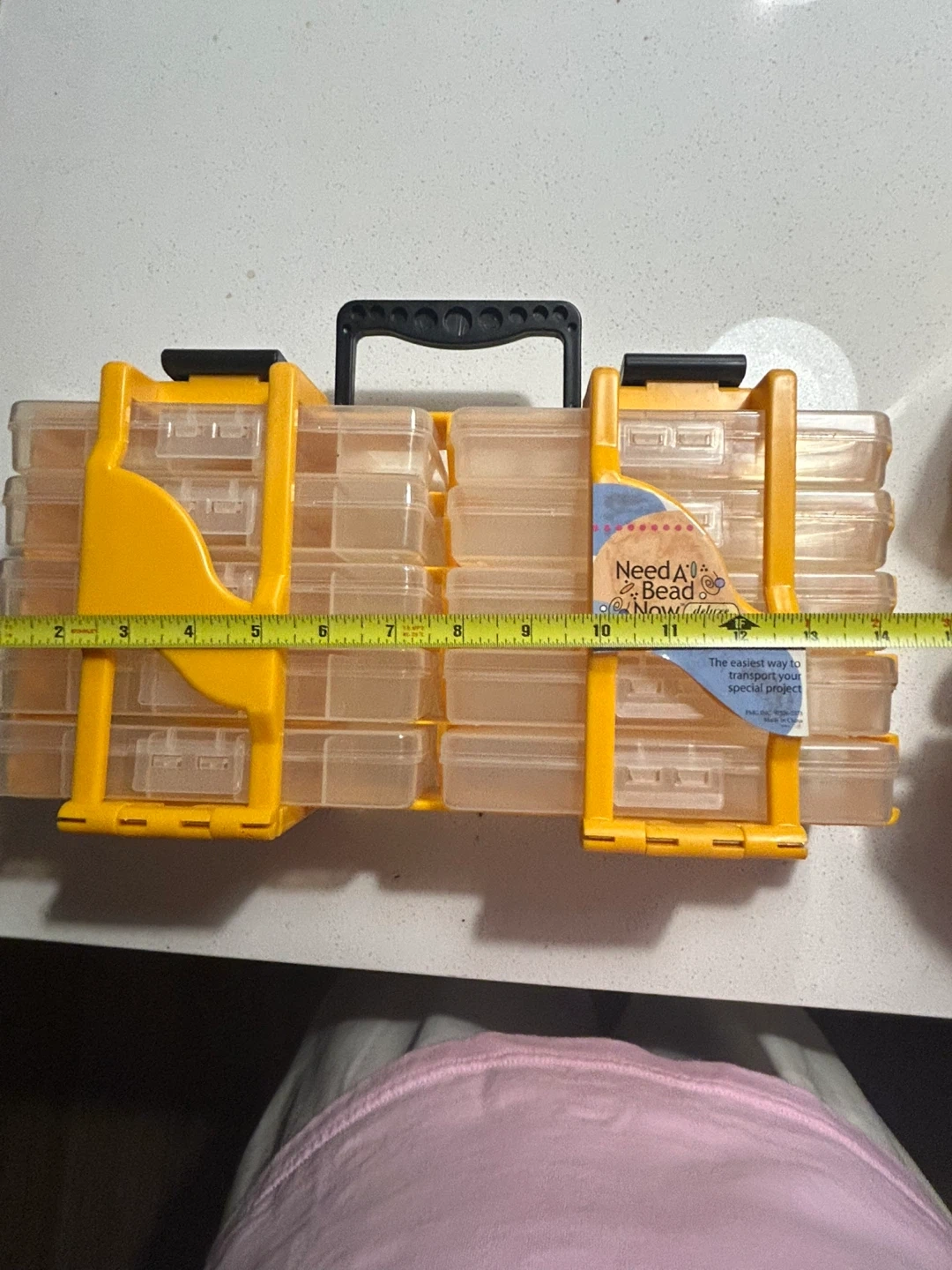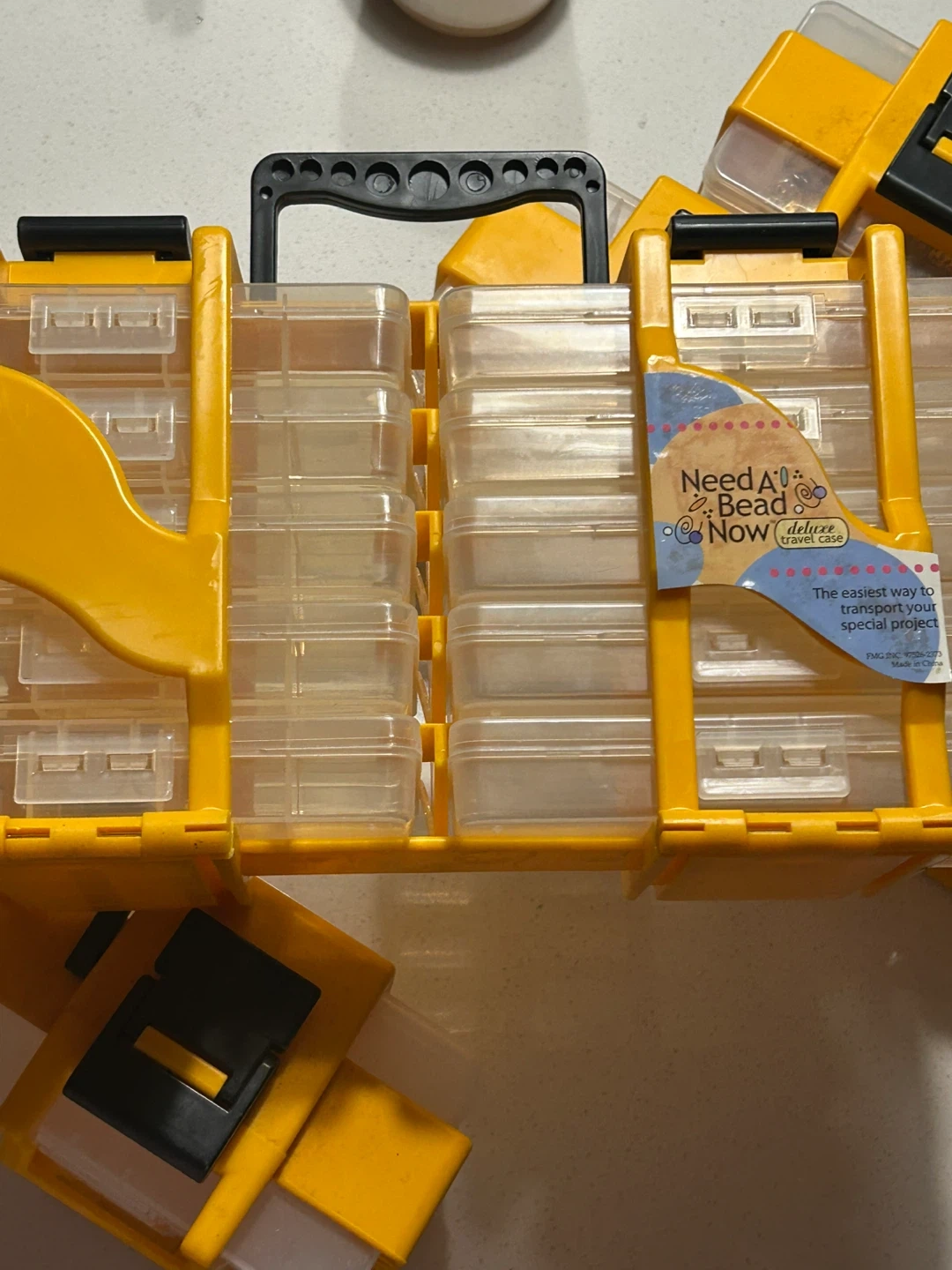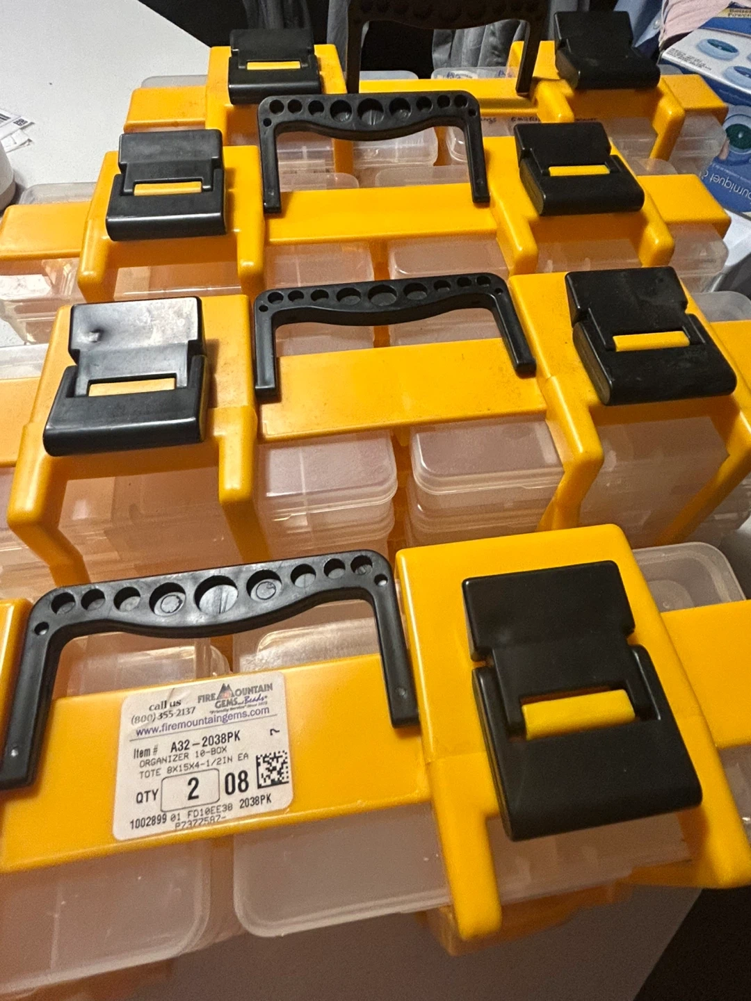 I'm selling 4 Fire Mountain Gems organizers in yellow and black. The label indicates it's item A32-2038PK. It looks like they’re in great shape and ready to help you organize your beads or other small items! It is 16 inches in length