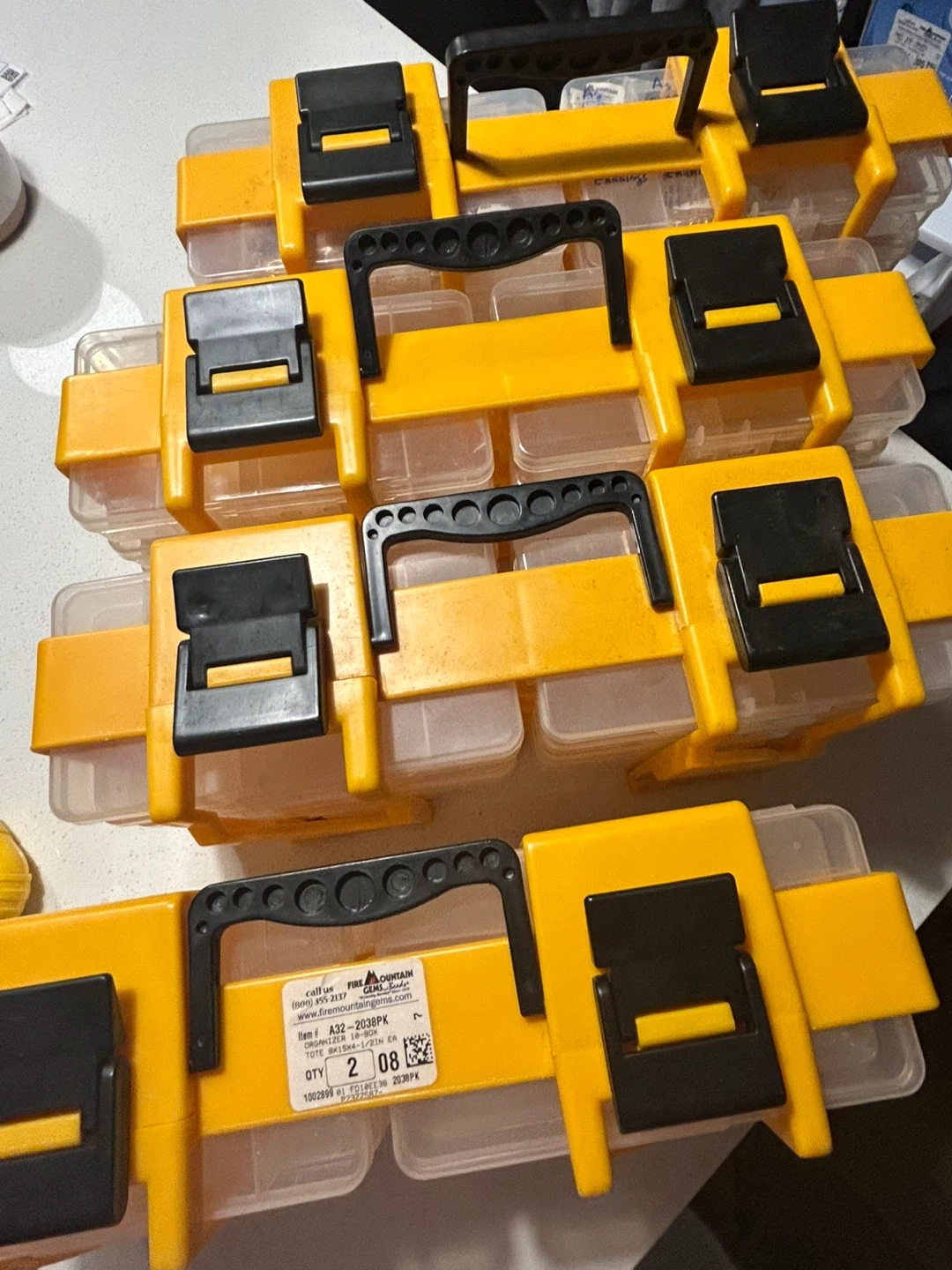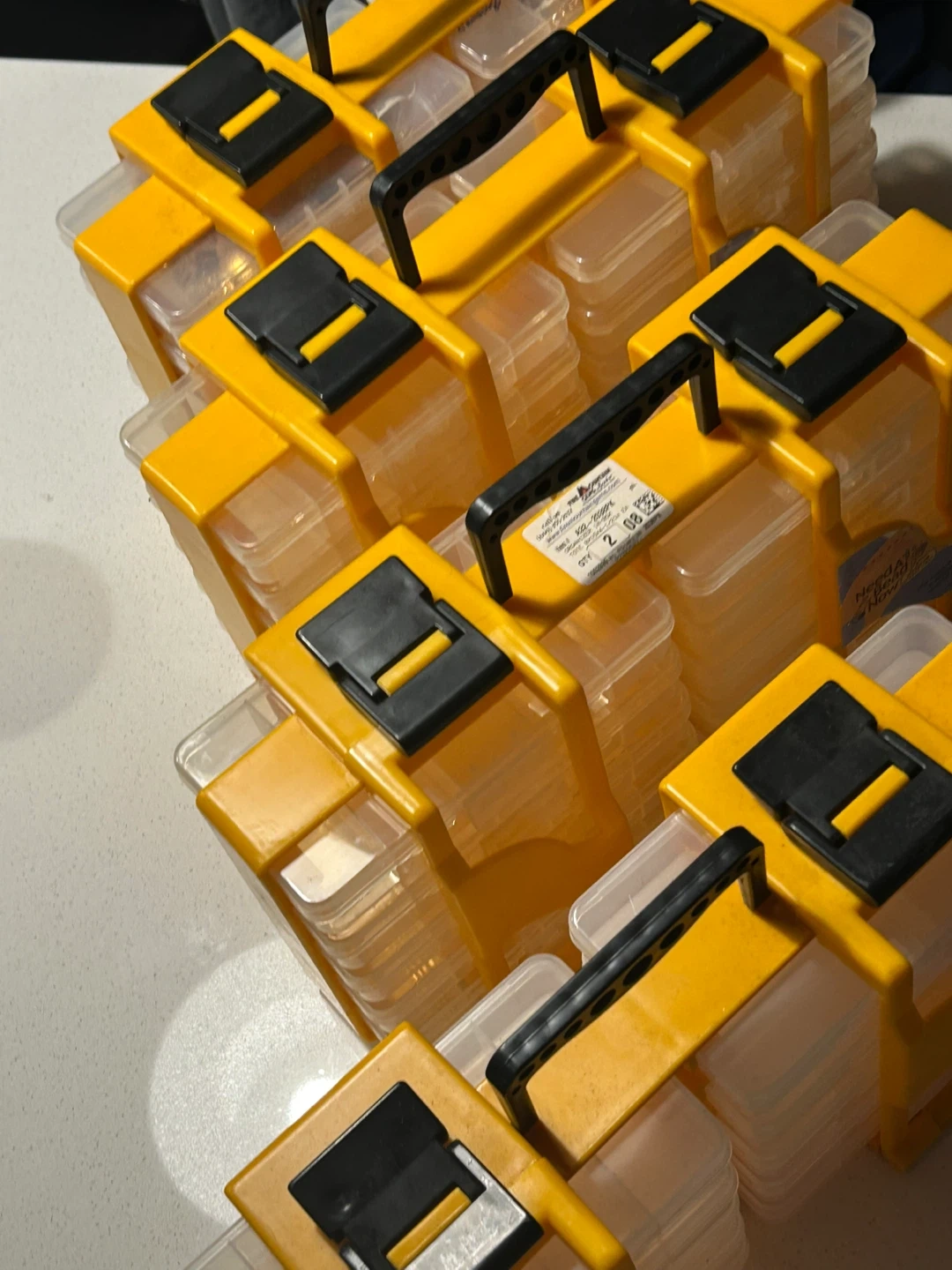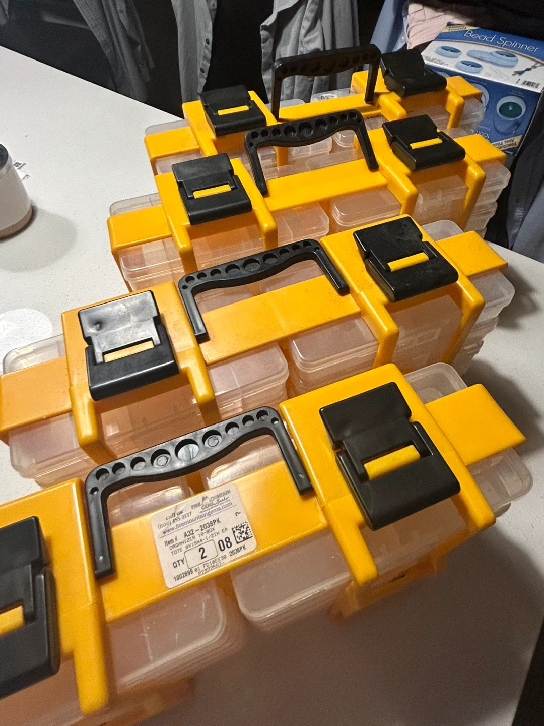 I'm selling 4 Fire Mountain Gems organizers in yellow and black. The label indicates it's item A32-2038PK. It looks like they’re in great shape and ready to help you organize your beads or other small items! It is 16 inches in length