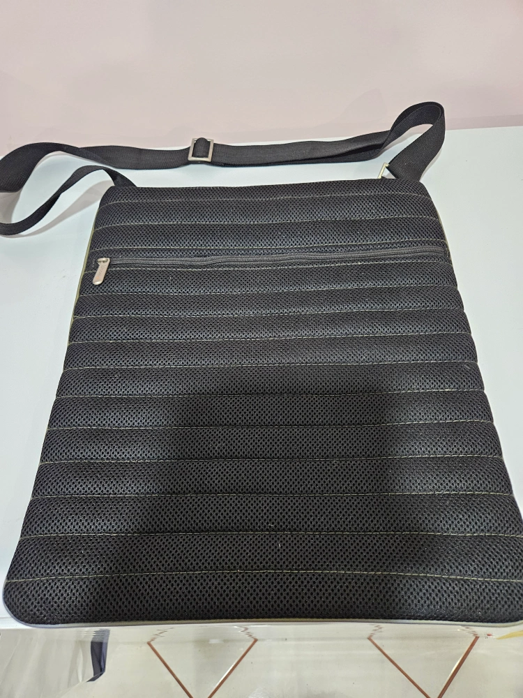 This is a black cloth bag with a zipper closure and an adjustable strap. It is made of a durable material that is lightweight and easy to carry. The bag is perfect for everyday use, whether you're running errands, going to the gym, or traveling. It's spacious enough to fit all of your essentials.Available for pick up in Bath Beach Brooklyn