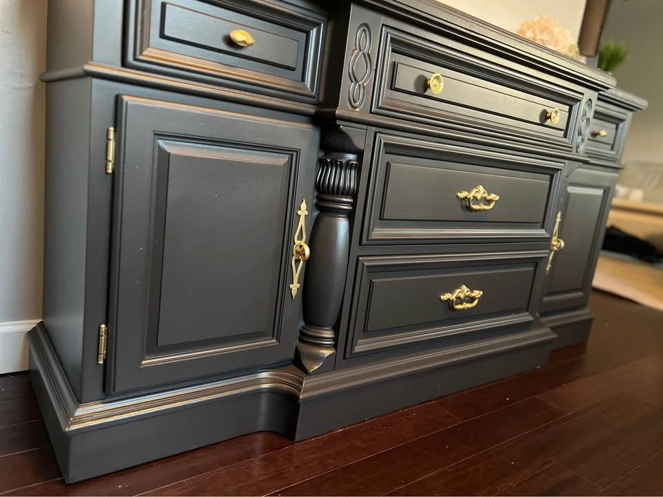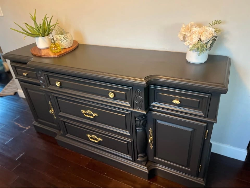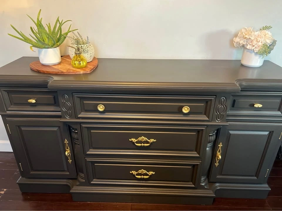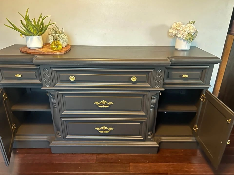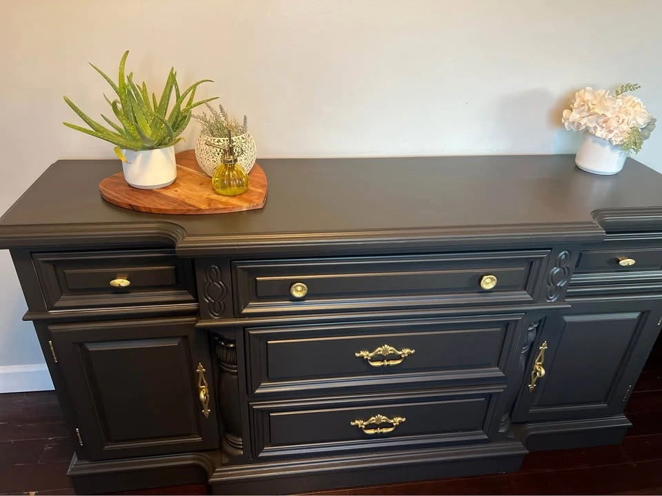 This is a beautiful solid wood Vintage buffet / sideboard. It's very heavy, so you will need 2 people to move it. Refinished in a beautiful black color with gold hardware. Dimensions: 68” W x 19” D x 34 1/2” Tall.