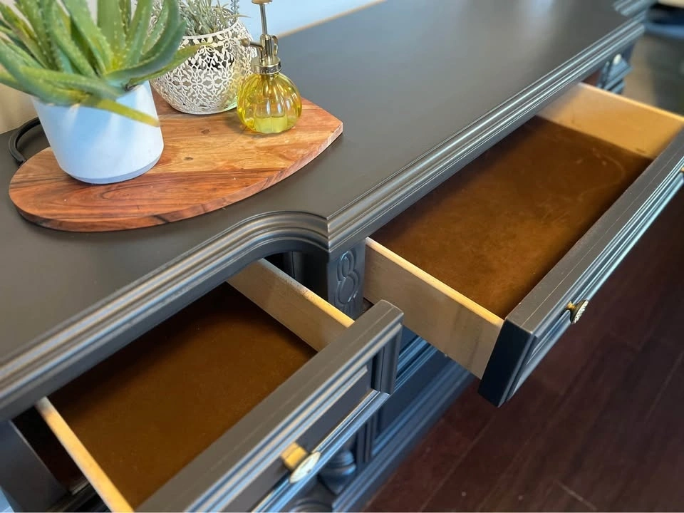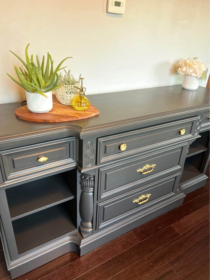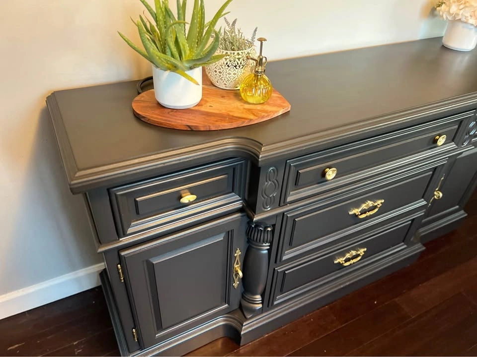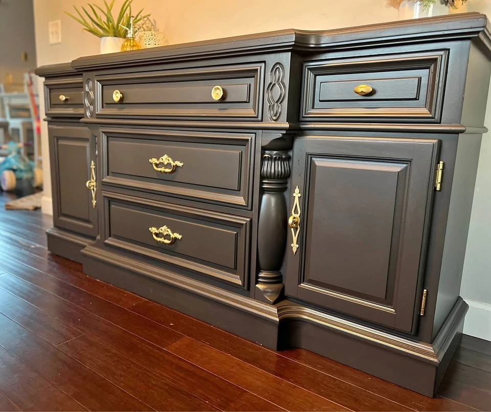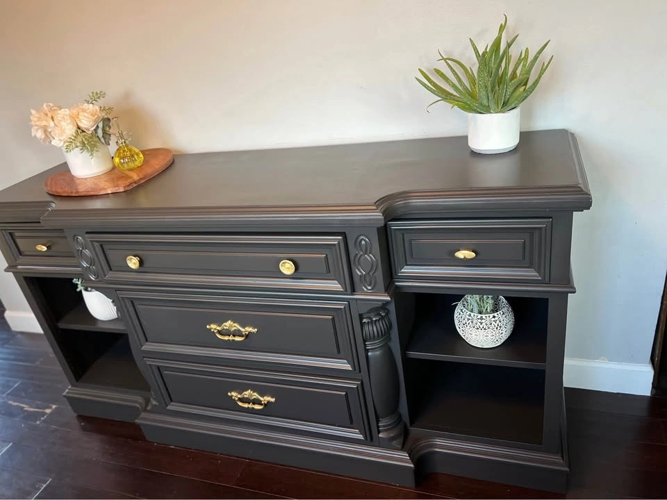 This is a beautiful solid wood Vintage buffet / sideboard. It's very heavy, so you will need 2 people to move it. Refinished in a beautiful black color with gold hardware. Dimensions: 68” W x 19” D x 34 1/2” Tall.