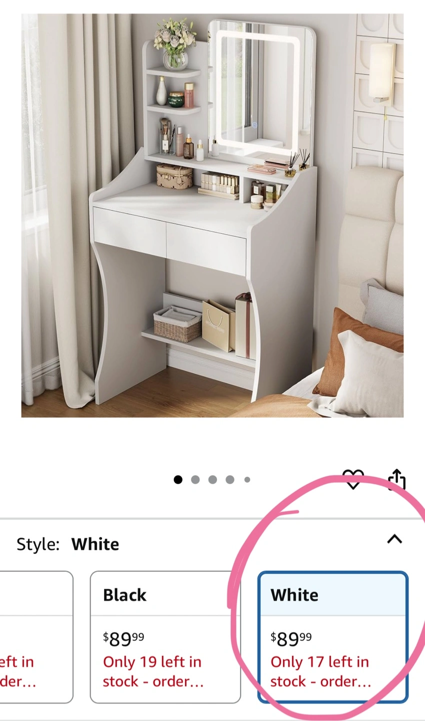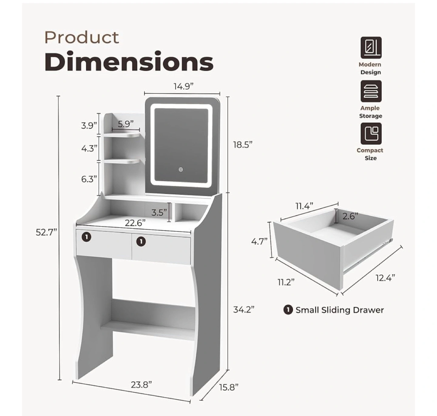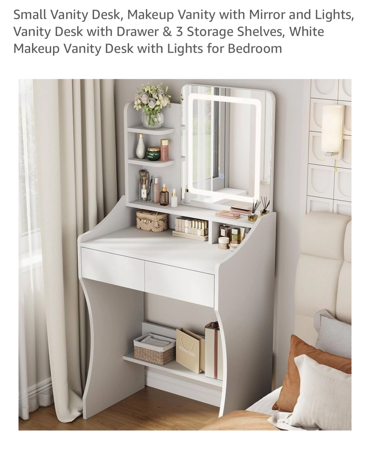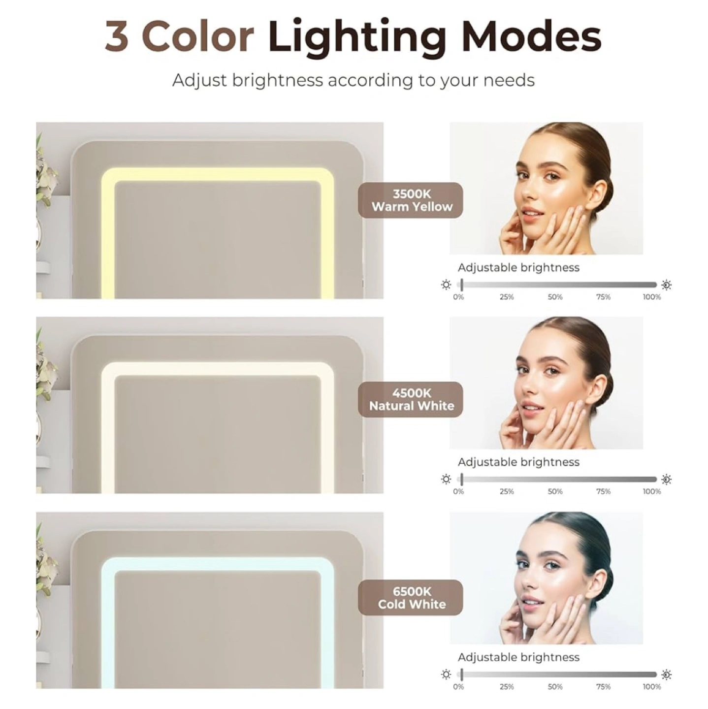 【Adjustable Light Mirror】This vanity desk with mirror and lights is equipped with a high-definition makeup mirror and provides three adjustable light modes: warm yellow, warm white, and cool white. Whether you are creating a daytime beauty makeup or a charming evening makeup, you can create an ideal for your beauty routine.