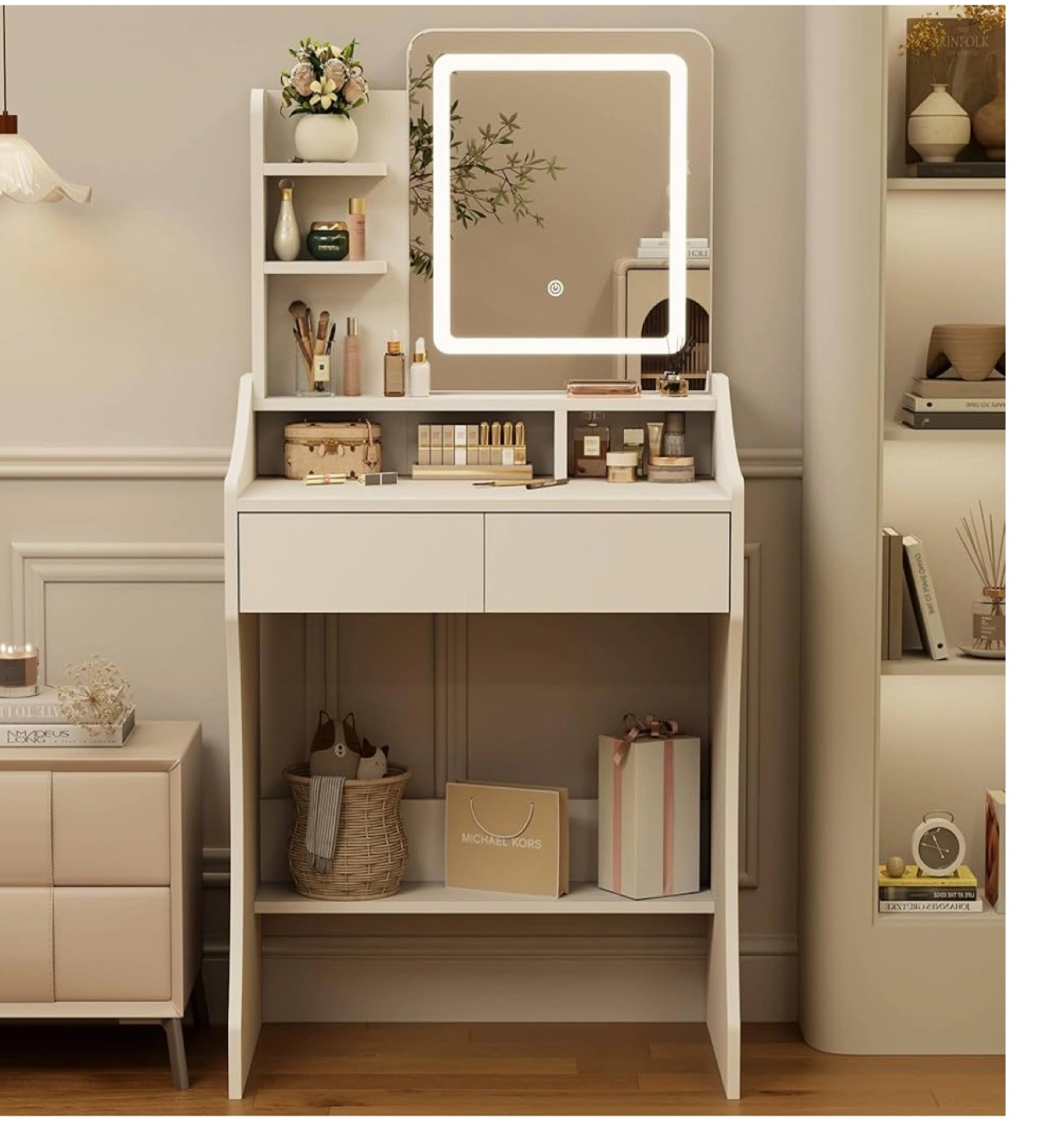 【Versatile Storage Space】This small vanity desk has smooth-gliding drawers, three open shelves, and a hidden compartment beneath the tabletop, you’ll have plenty of room to organize cosmetics, skincare, and everyday essentials while keeping your space clutter-free.