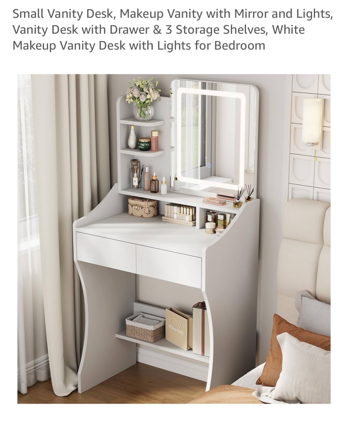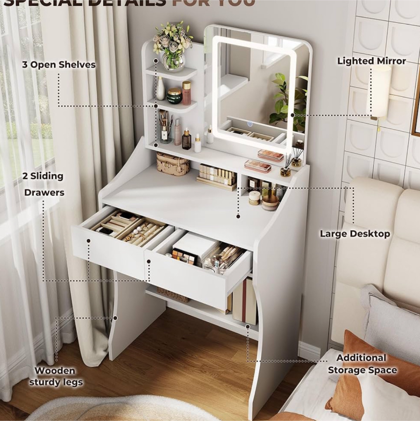 【Versatile Storage Space】This small vanity desk has smooth-gliding drawers, three open shelves, and a hidden compartment beneath the tabletop, you’ll have plenty of room to organize cosmetics, skincare, and everyday essentials while keeping your space clutter-free.