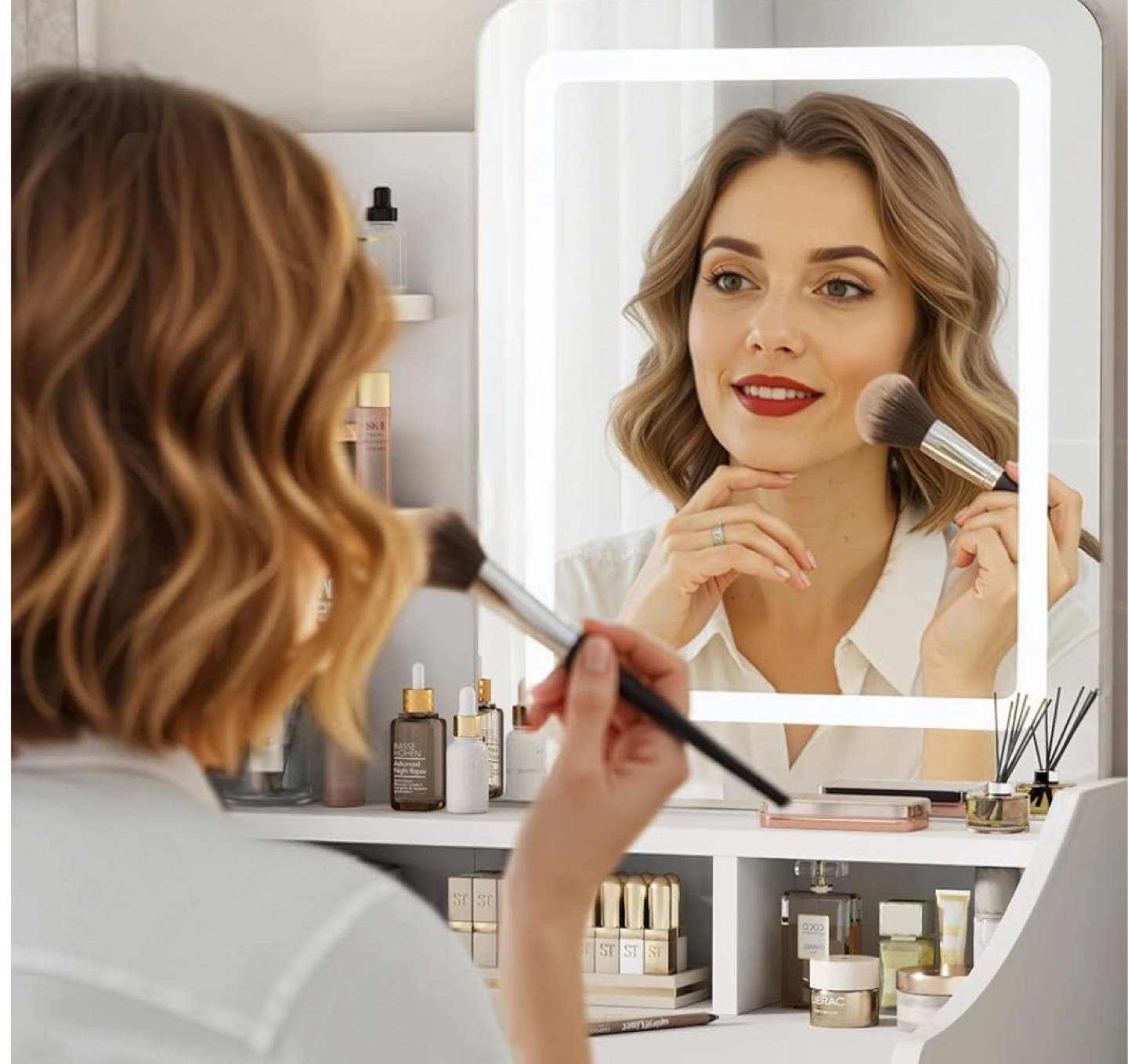 【Adjustable Light Mirror】This vanity desk with mirror and lights is equipped with a high-definition makeup mirror and provides three adjustable light modes: warm yellow, warm white, and cool white. Whether you are creating a daytime beauty makeup or a charming evening makeup, you can create an ideal for your beauty routine.