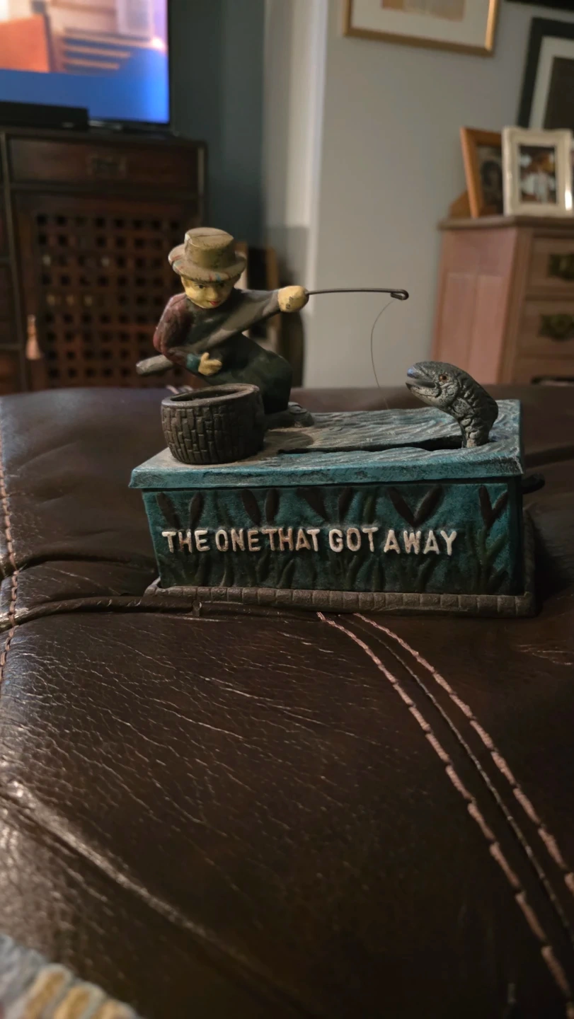 Coin bank featuring "The One That Got Away" text. Includes a tire and a snake design element. Made of a durable material, likely resin or ceramic.