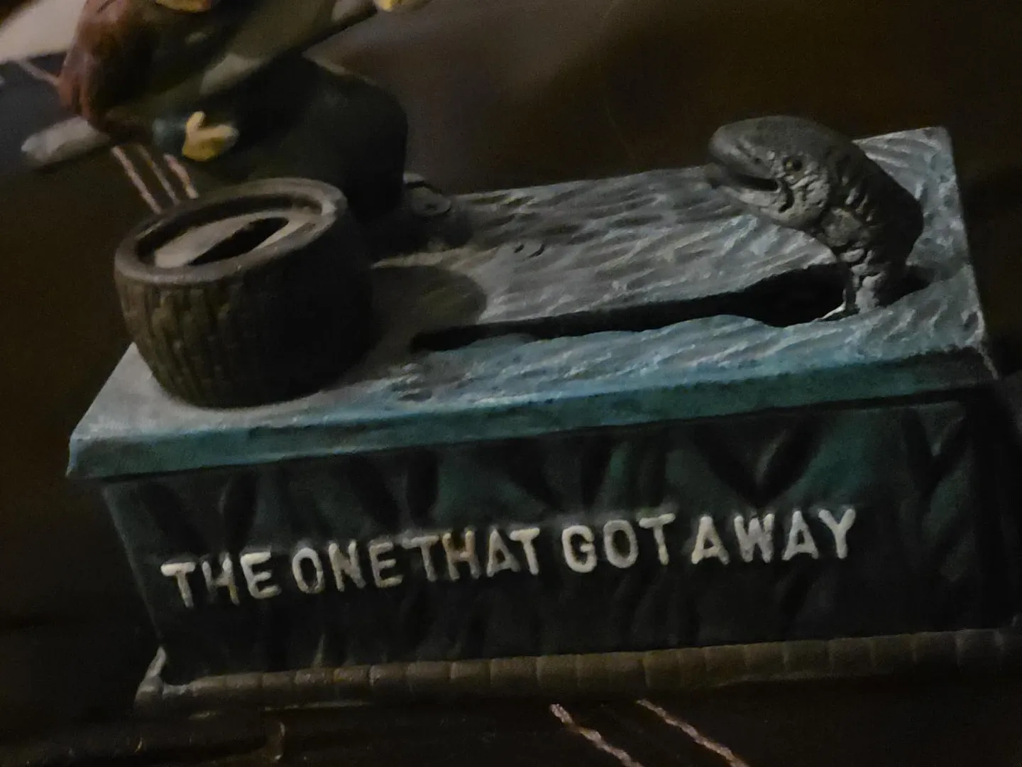 Coin bank featuring "The One That Got Away" text. Includes a tire and a snake design element. Made of a durable material, likely resin or ceramic.