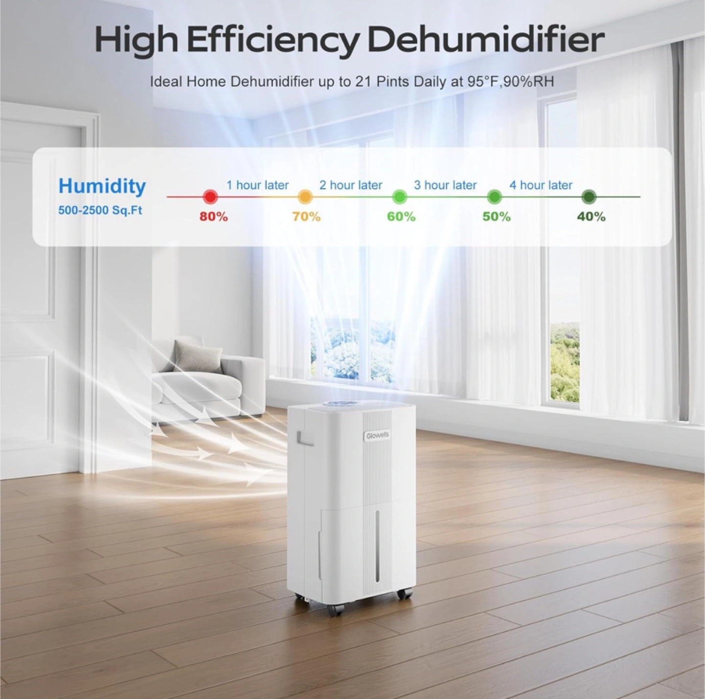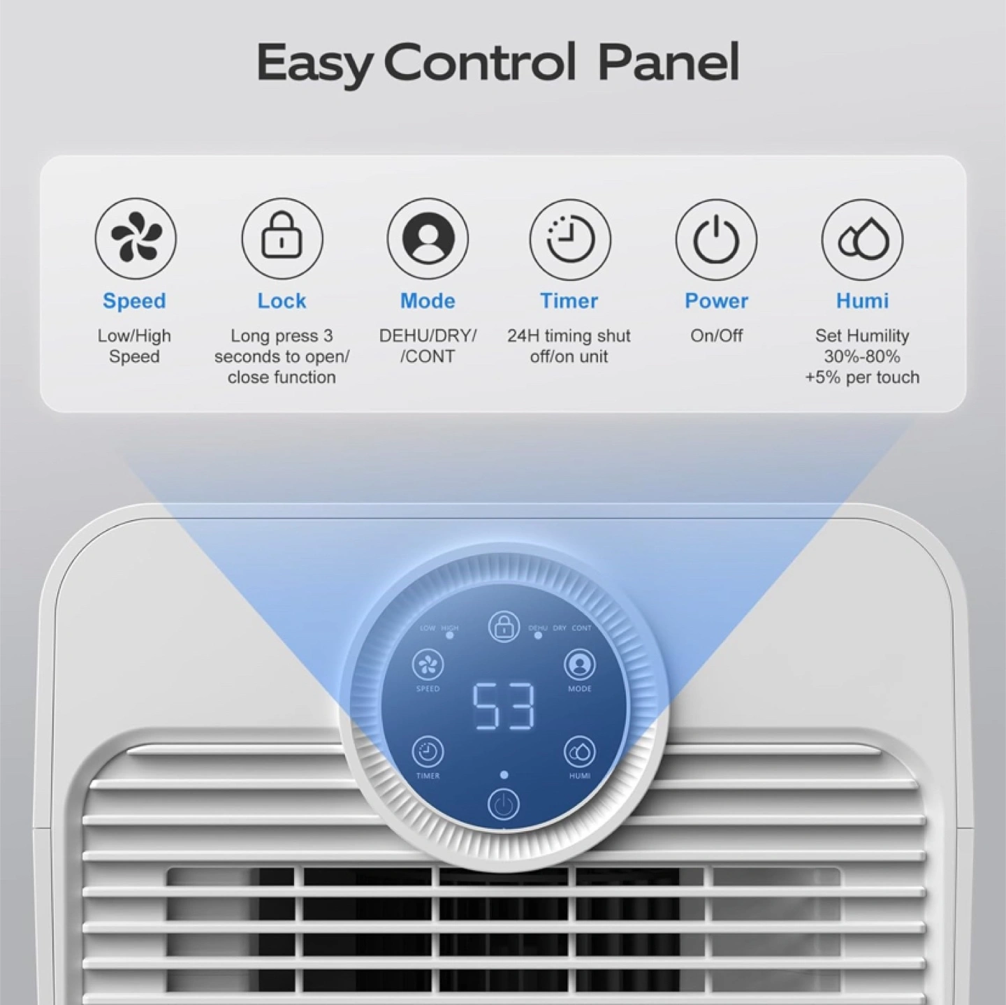 It's a high-efficiency dehumidifier, ideal for home use, and can handle up to 21 pints daily at 95°F and 90% RH! The easy control panel lets you adjust speed, lock settings, mode, timer, power, and humidity