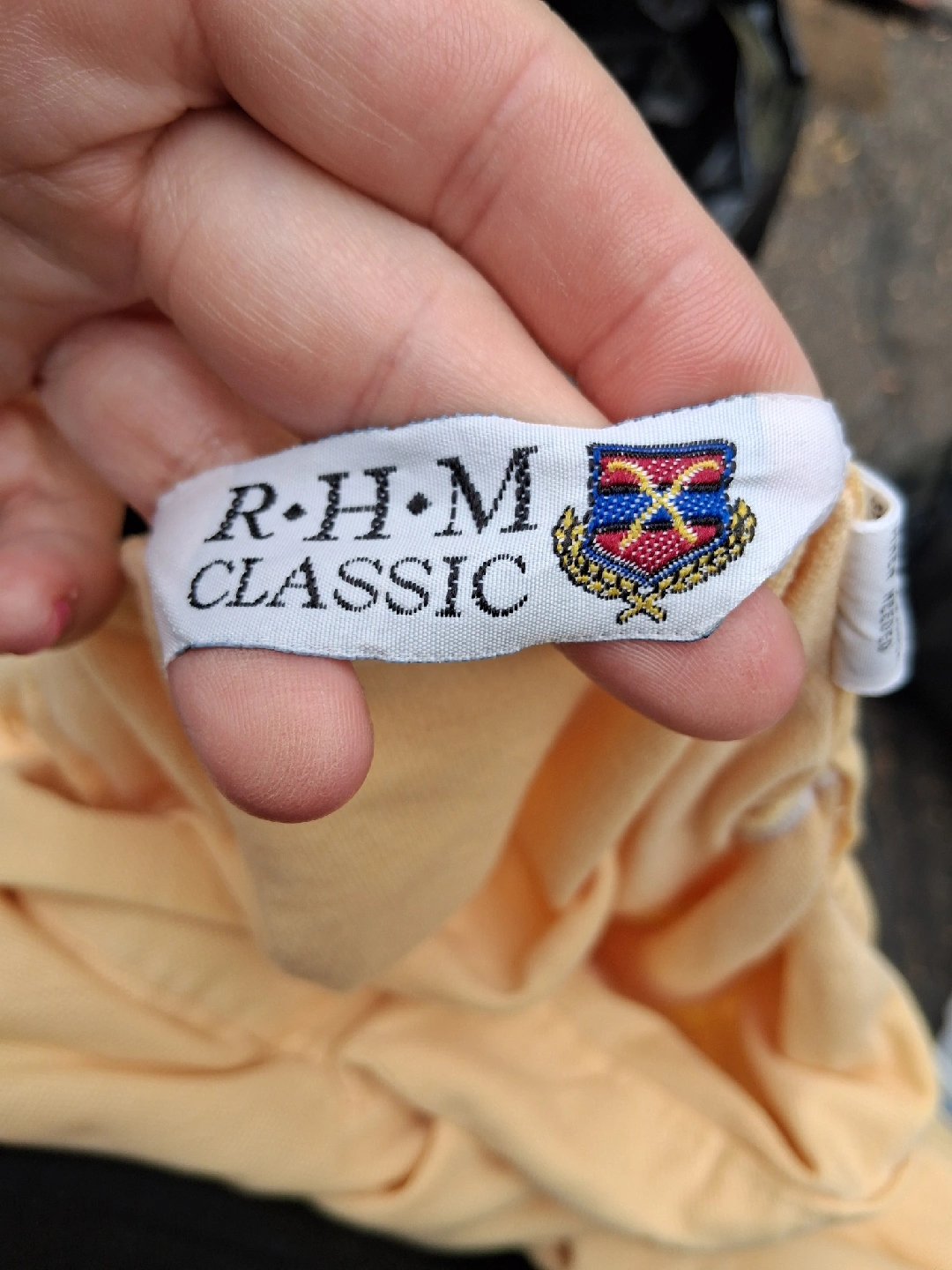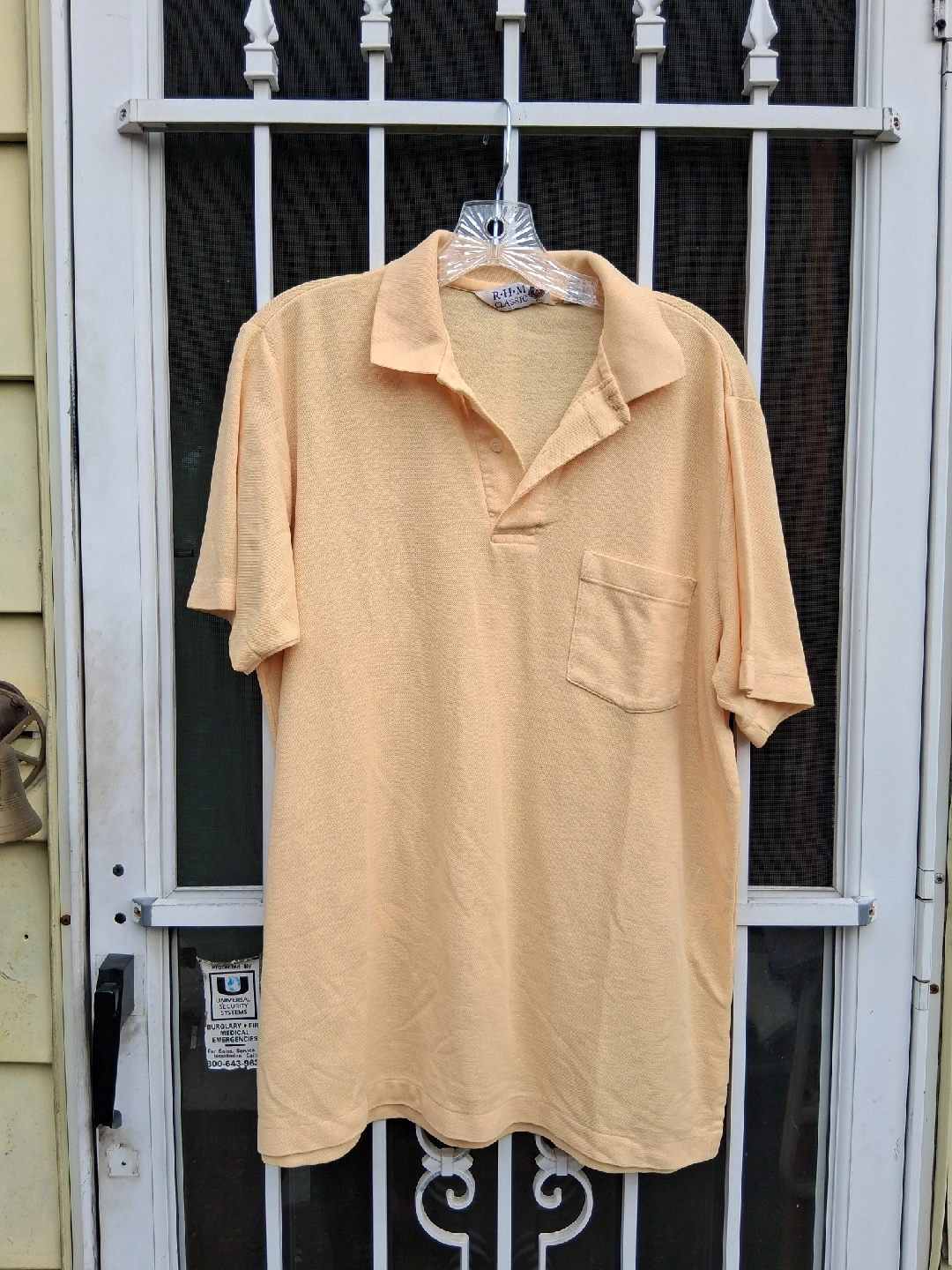 Here's a classic yellow polo shirt from R.H.M Classic! It's in good condition and ready for a new home. The shirt features a small pocket on the front and is made of a comfortable material. Perfect for casual wear or a relaxed day out.