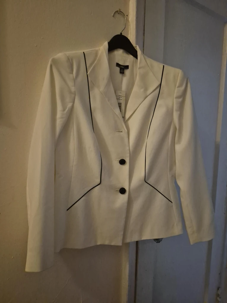 86Selling a R&K blazer in white. It's a size 12 and features a classic design with black accents. Perfect for a professional or stylish look!