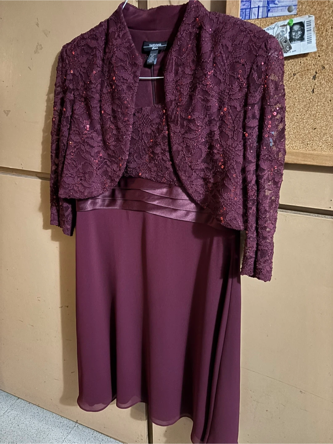 10Selling a beautiful R & M Richards dress with a matching bolero jacket. The dress is a lovely burgundy color and features a satin band at the waist. The bolero is a lace fabric with sequins Pick up if interested