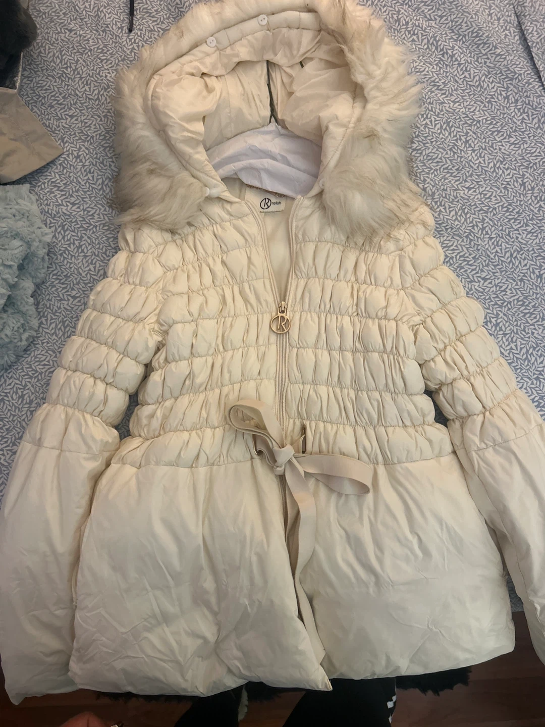 60Selling a white puffer coat from R Reiss. It's in great condition and features a faux fur hood and a tie around the waist