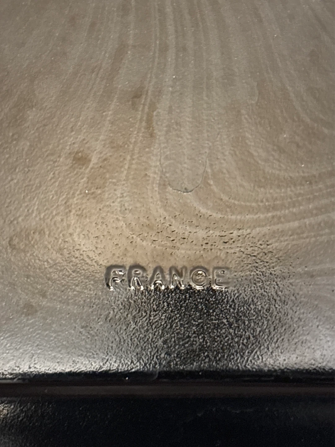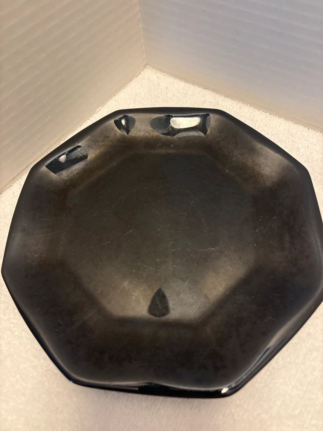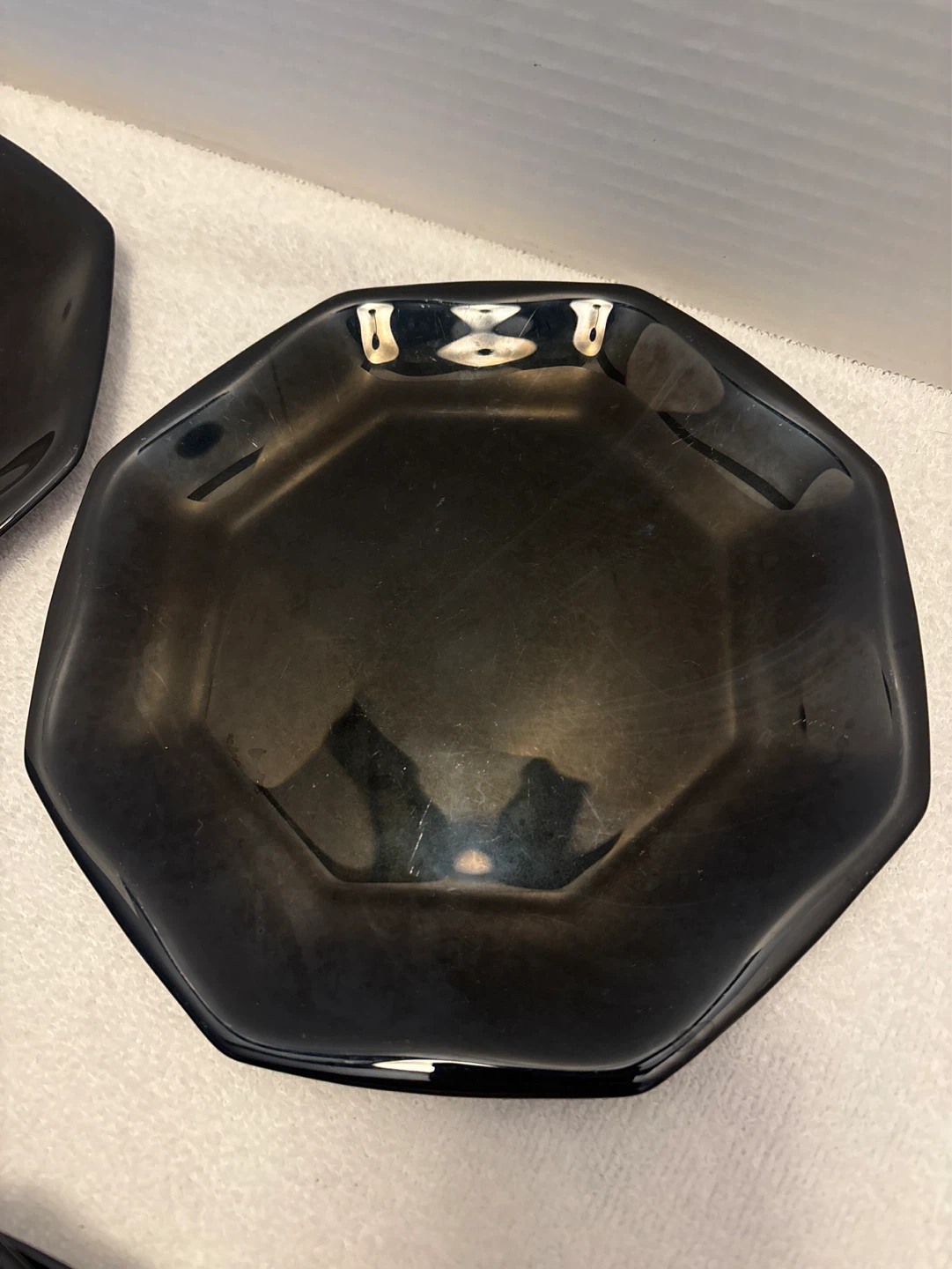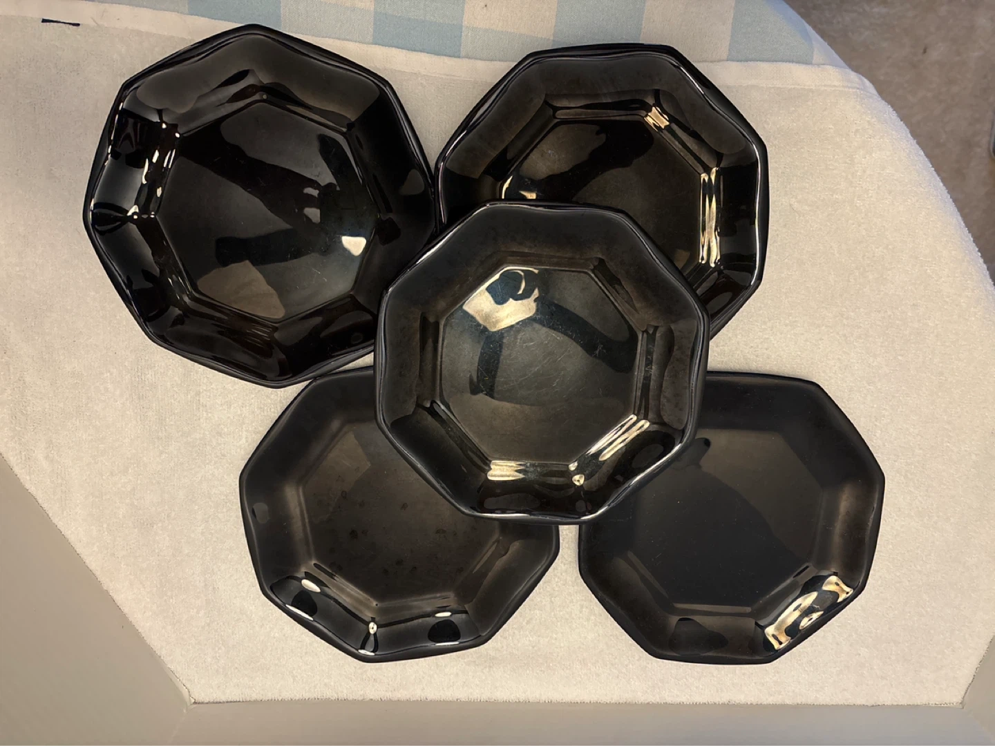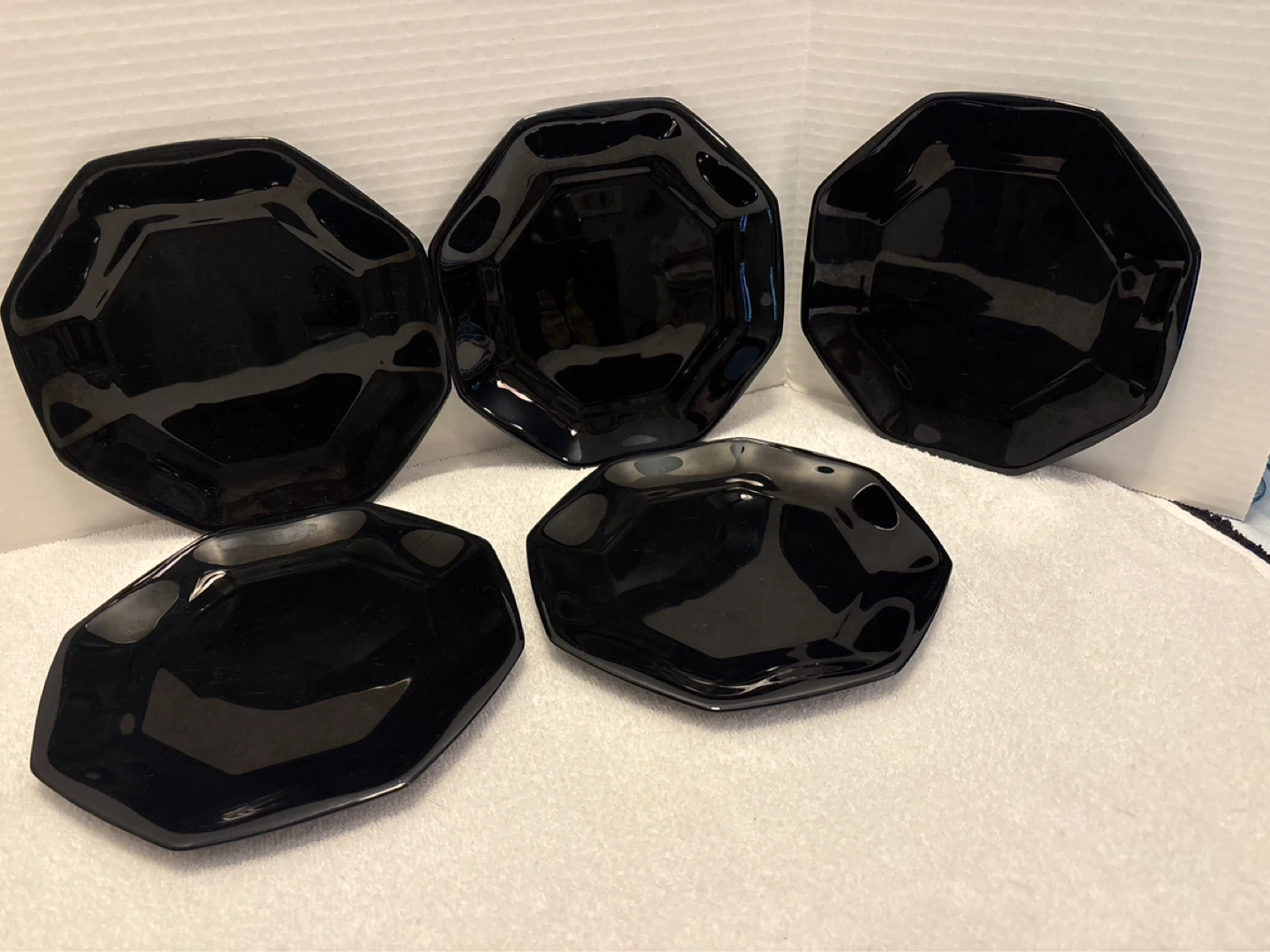 These five octagonal serving plates are black and made in France. They're perfect for appetizers or small dishes. The reflective surface adds a touch of elegance to any table setting!