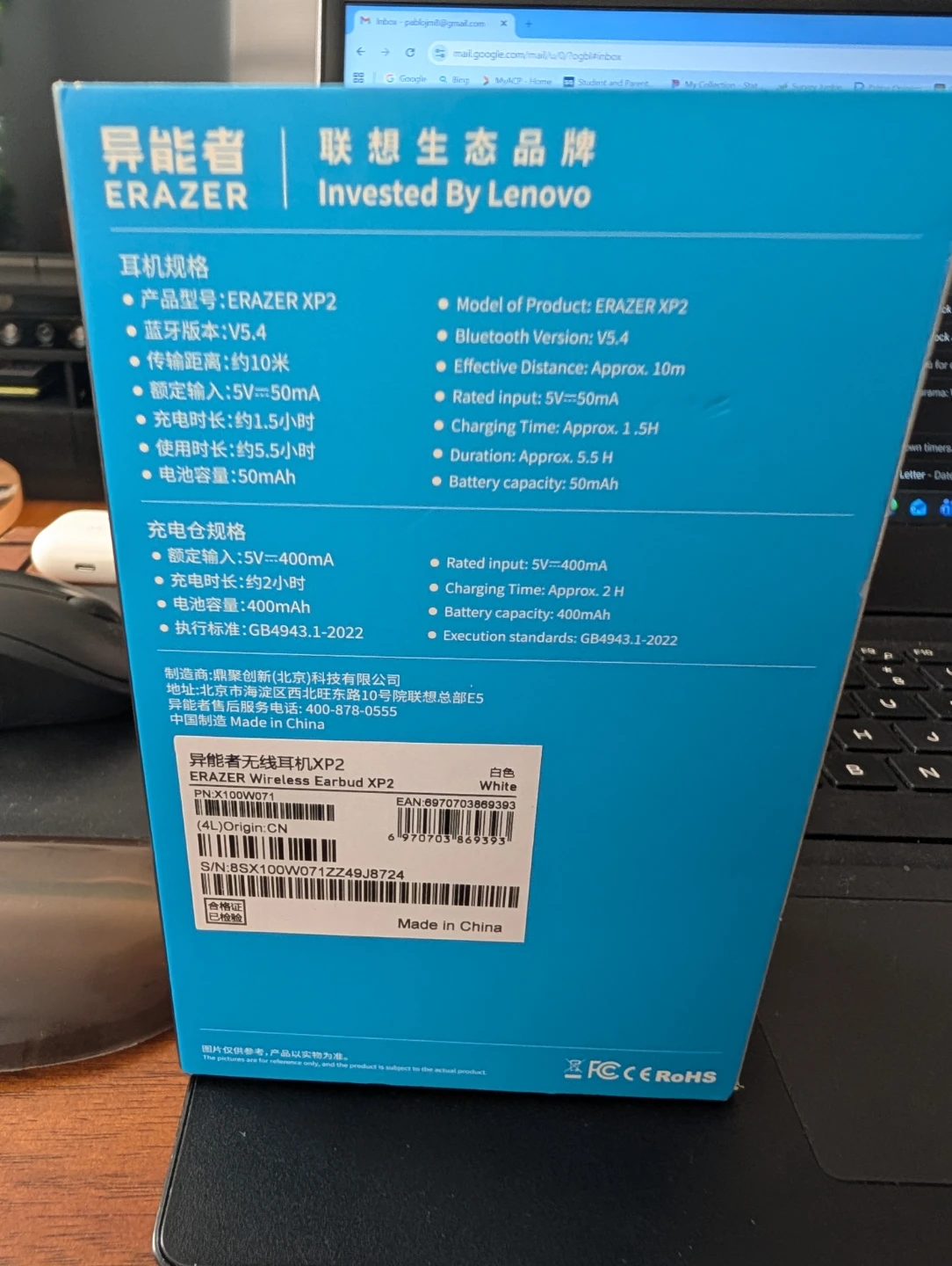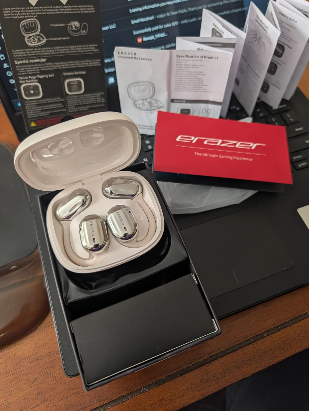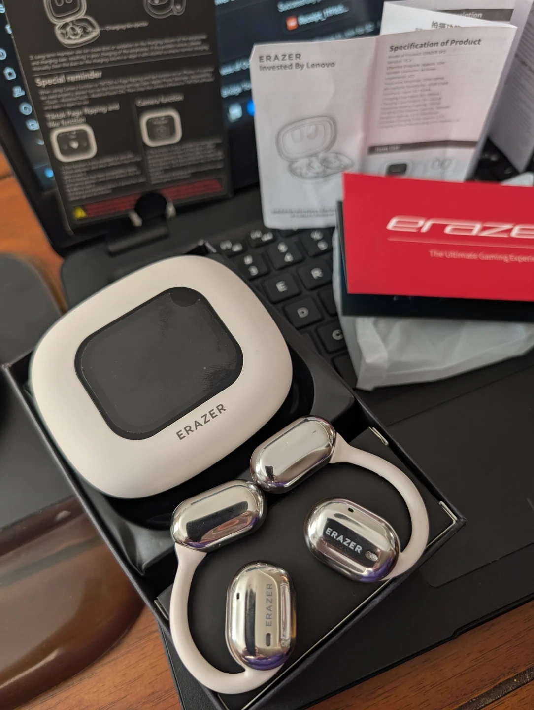 These are the new Erazer Wireless Earbud XP2, invested by Lenovo. They feature Bluetooth version 5.4 and have an effective distance of approximately 10 meters. Battery capacity is 400mAh.