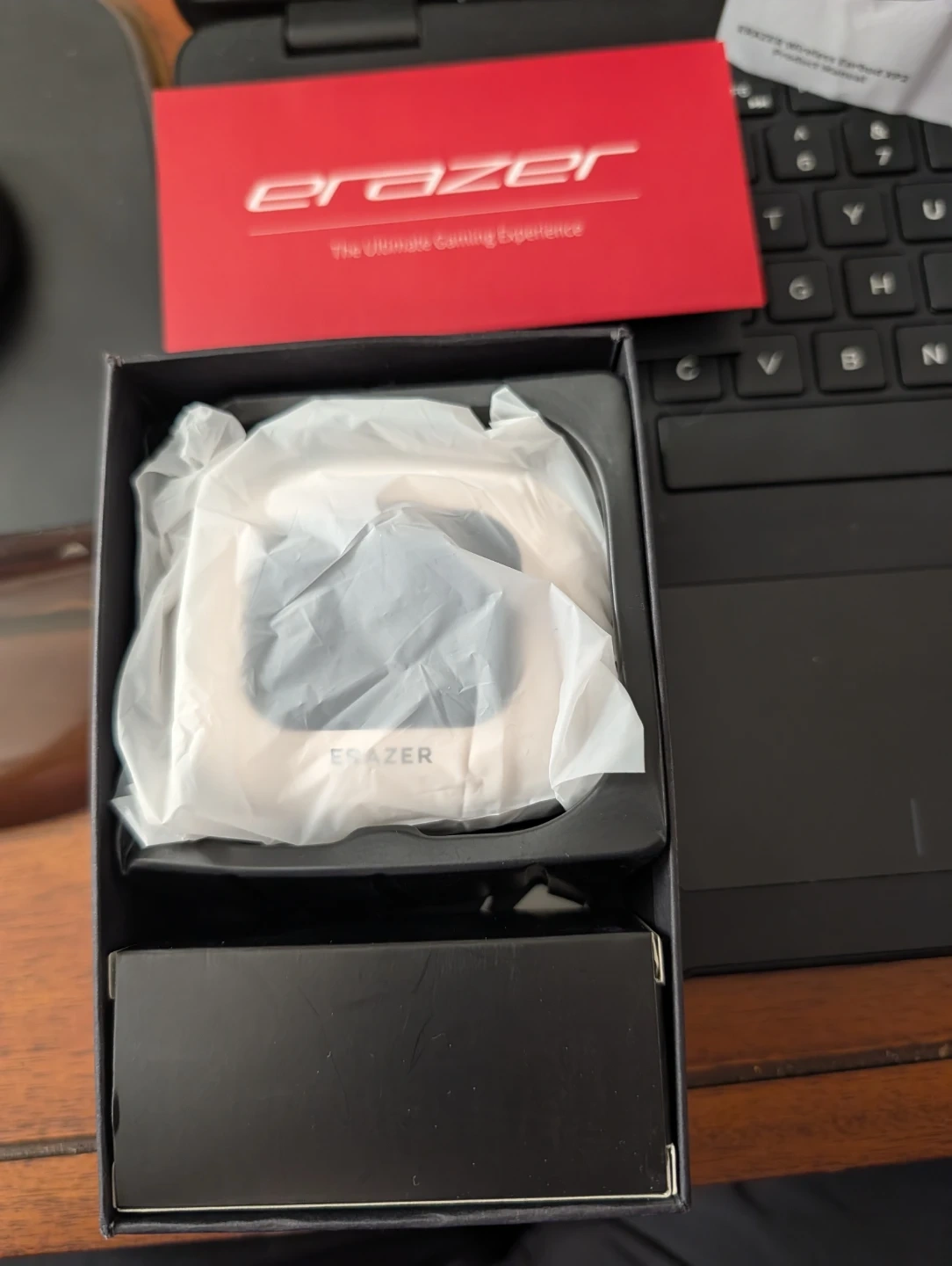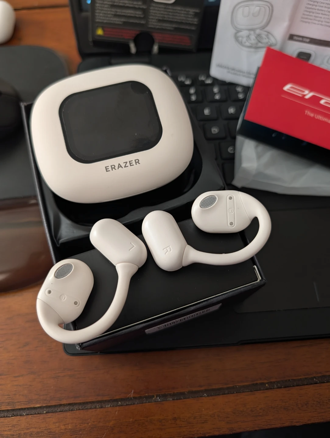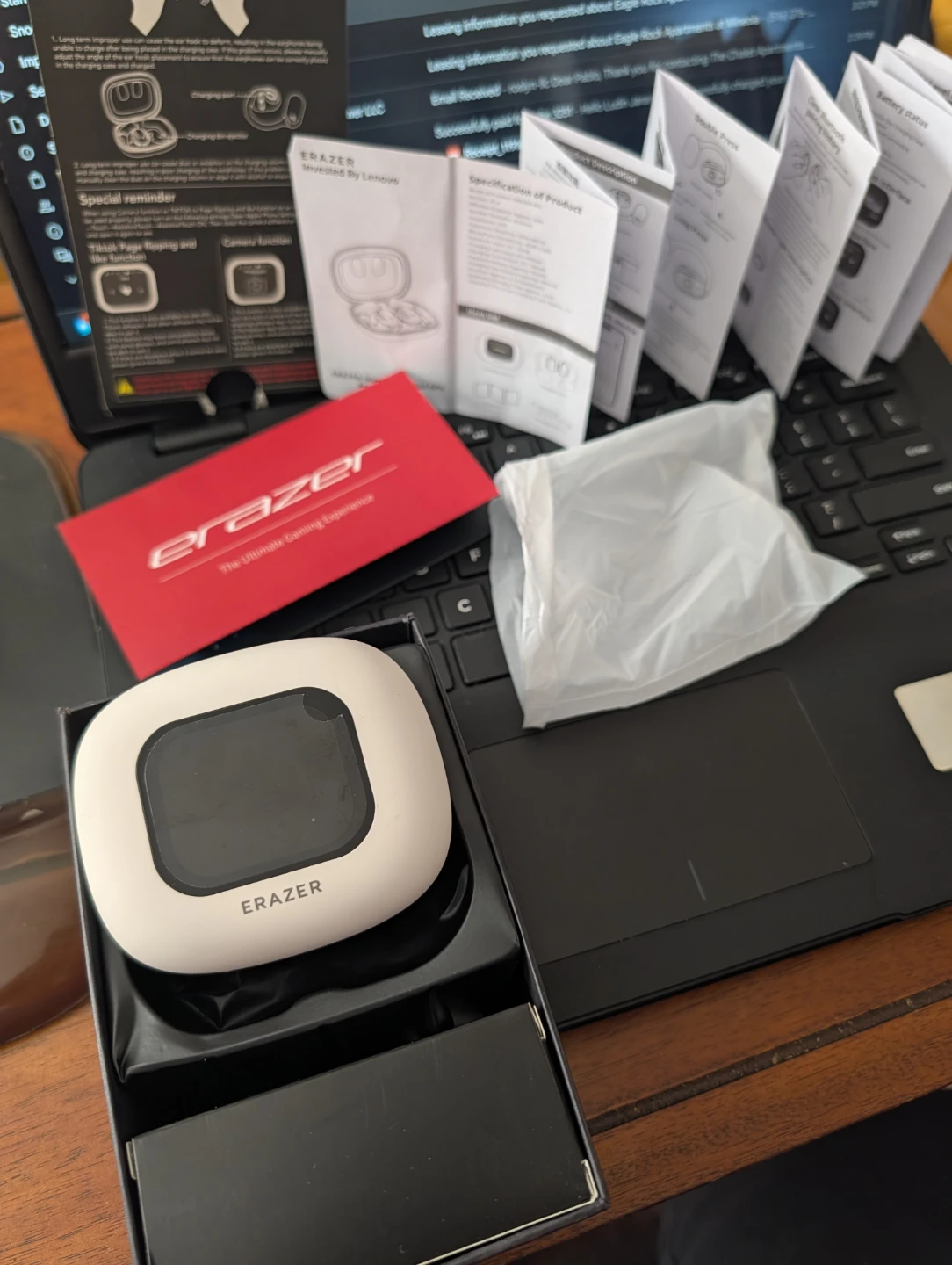 These are the new Erazer Wireless Earbud XP2, invested by Lenovo. They feature Bluetooth version 5.4 and have an effective distance of approximately 10 meters. Battery capacity is 400mAh.