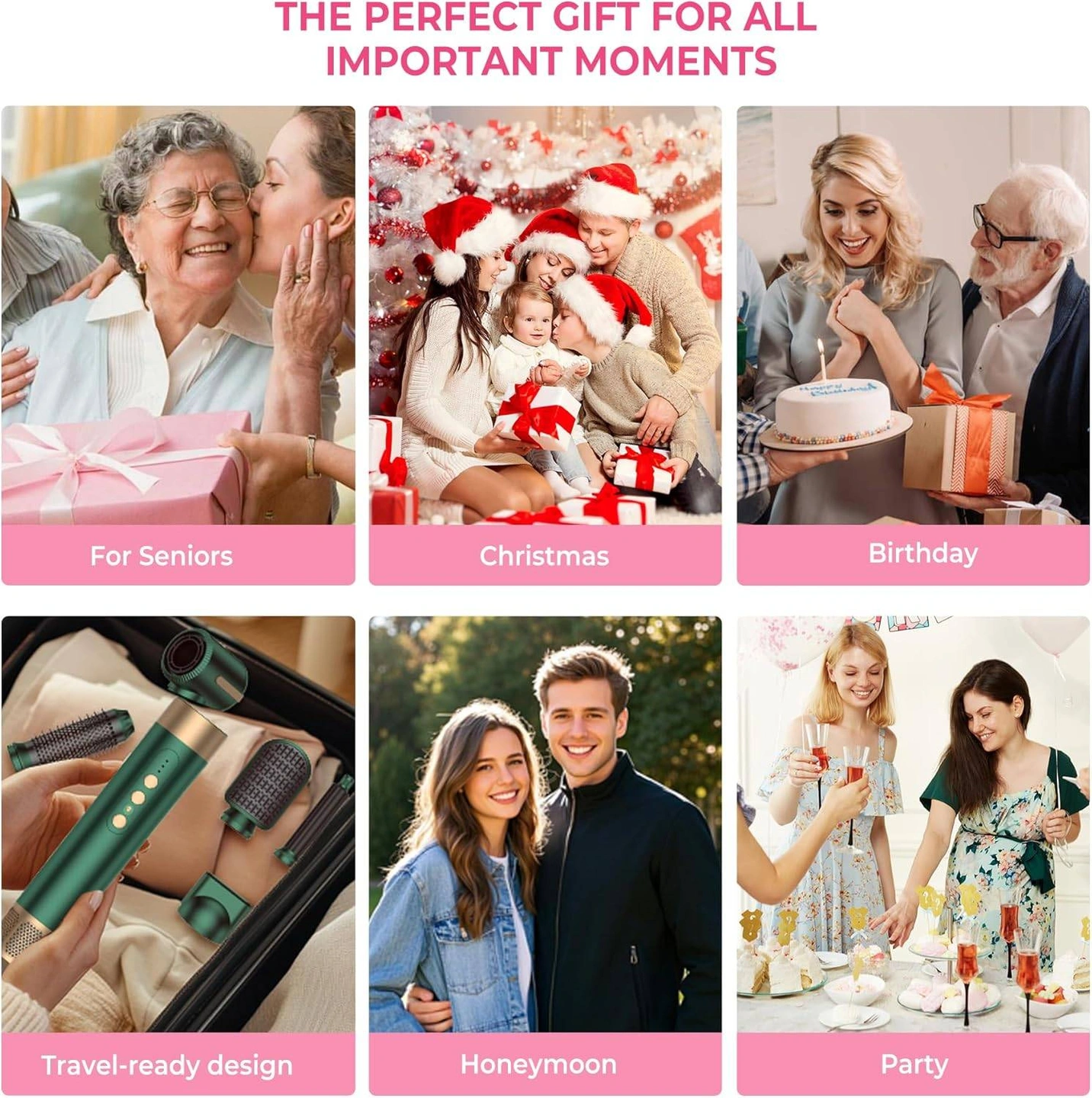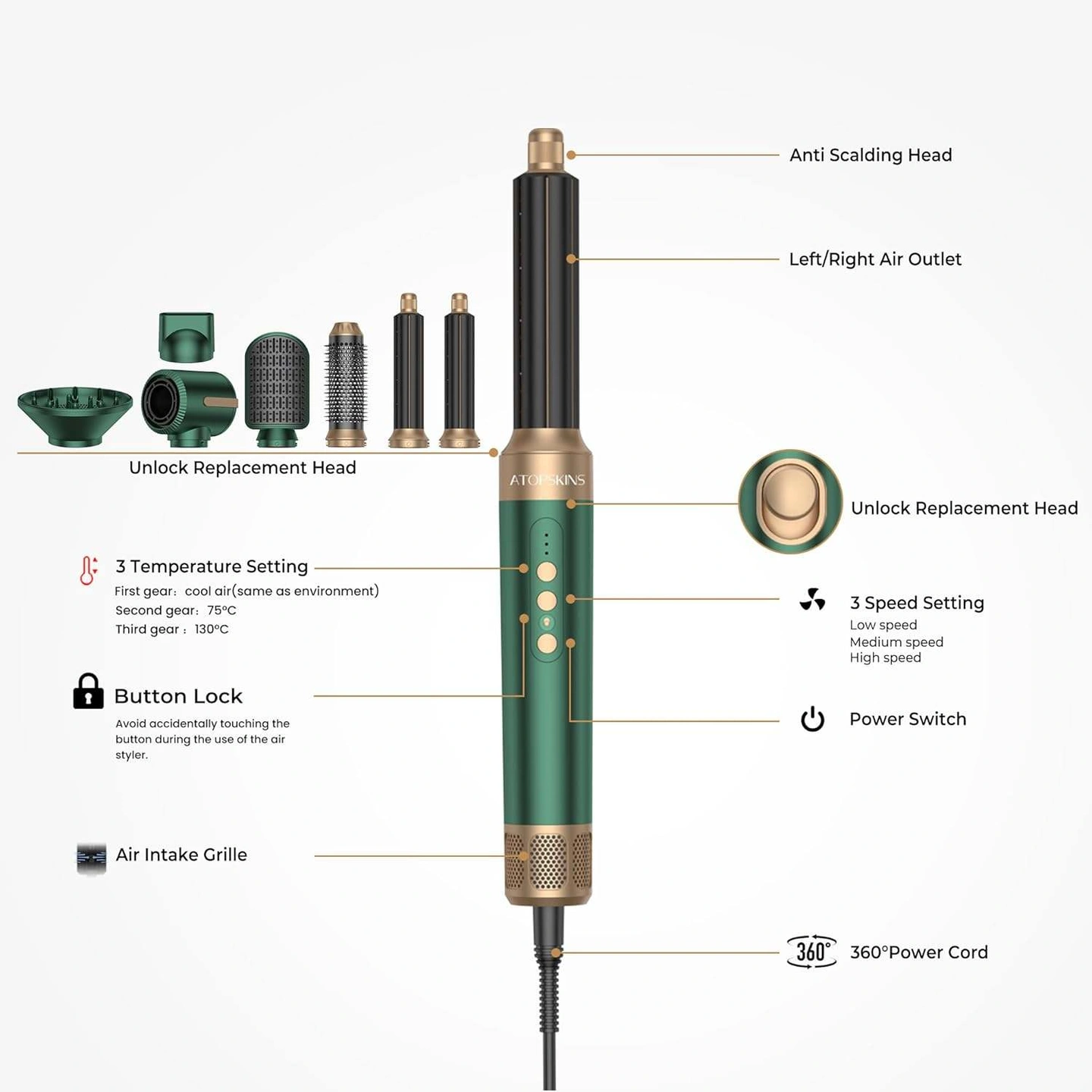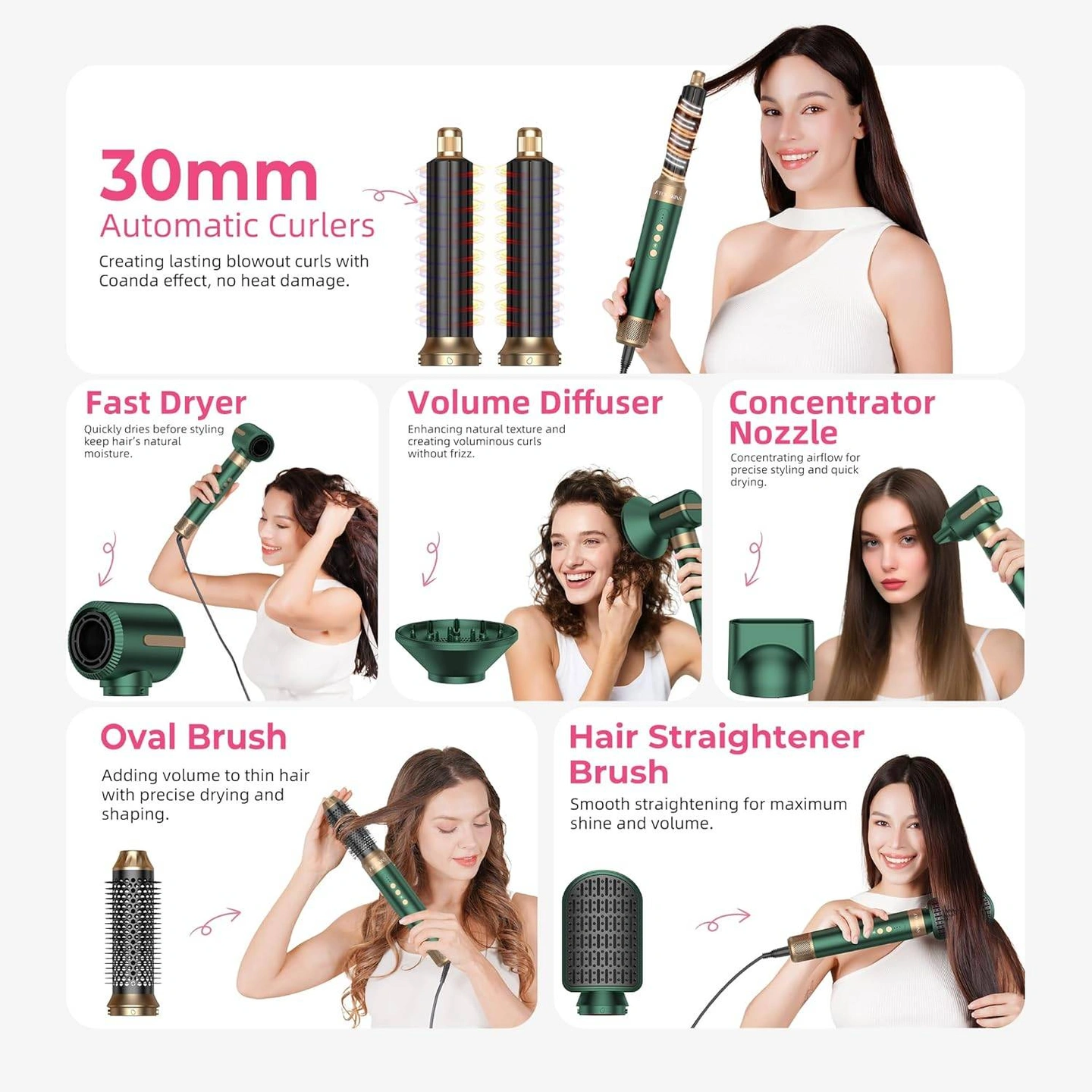 7-in-1 Multi-Functional Hair Styling Kit:Complete with hair dryer, automatic curler, massage straightening brush, volumizing brush, diffuser, and concentrator attachments to meet all styling needs.